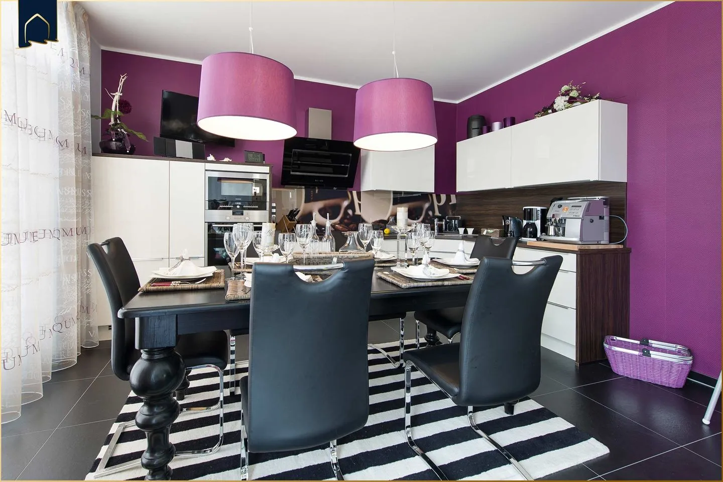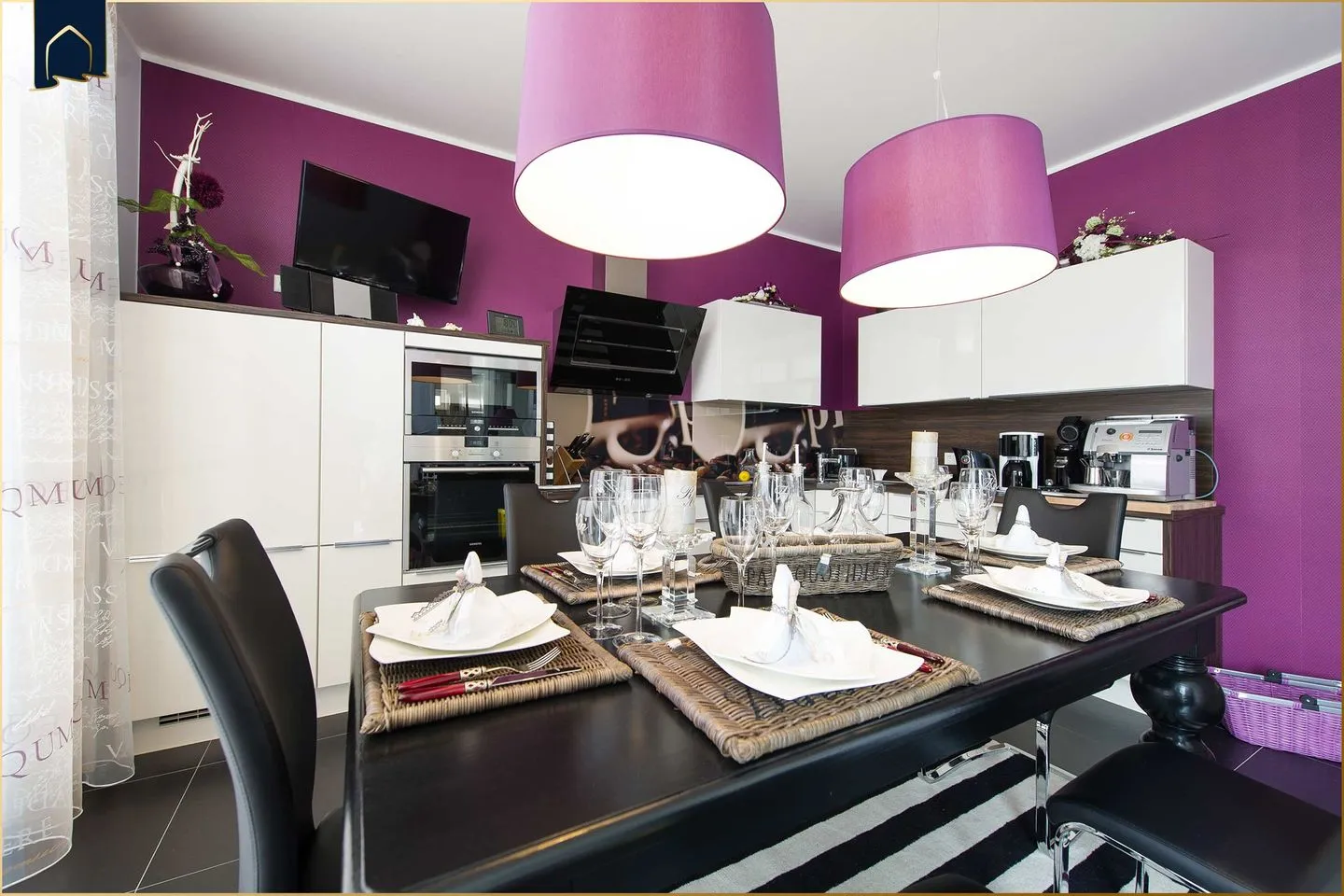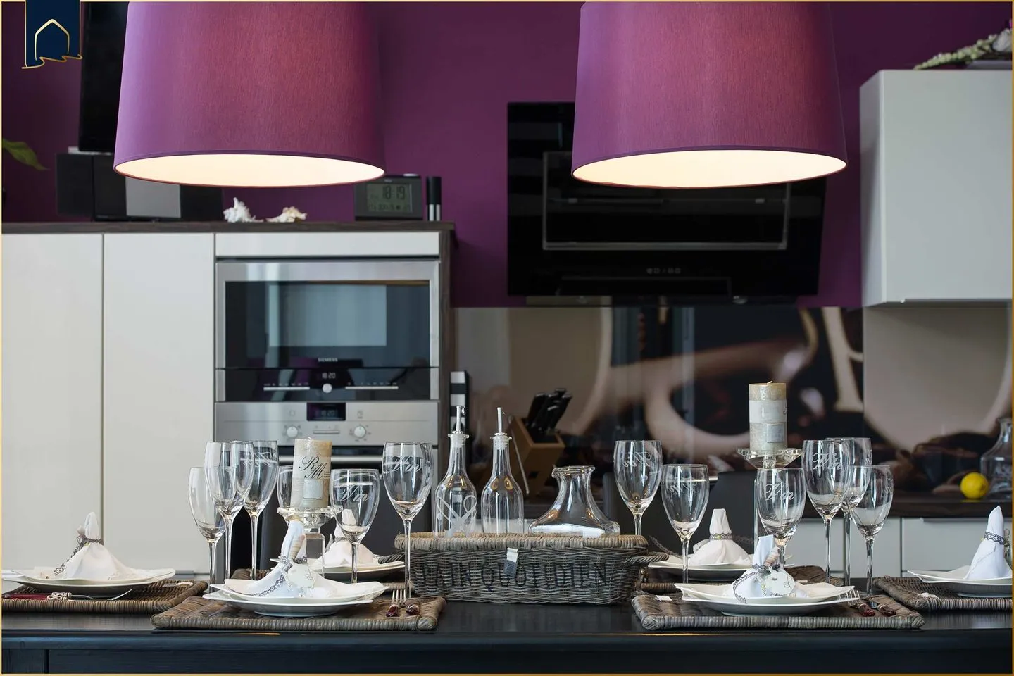 Die offene Designküche beeindruckt durch ihre moderne Ausstattung und ein elegantes Farbkonzept in kräftigem Violett, kombiniert mit glänzend weißen Fronten. Hochwertige Einbaugeräte von Siemens – darunter Backofen, Mikrowelle und Geschirrspüler – bieten alles, was anspruchsvolle Hobbyköche benötigen. Eine hochwertige Kaffeemaschine, Wasserkocher und Toaster stehen ebenfalls bereit.