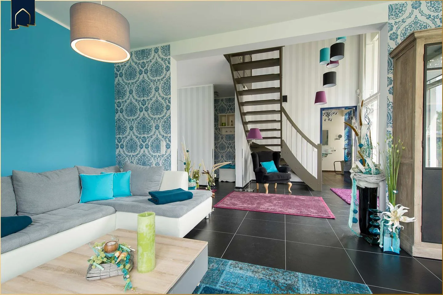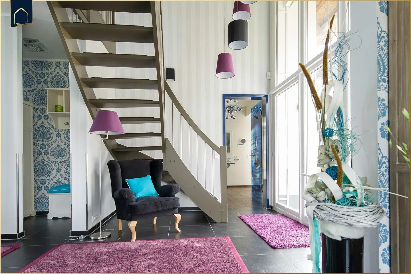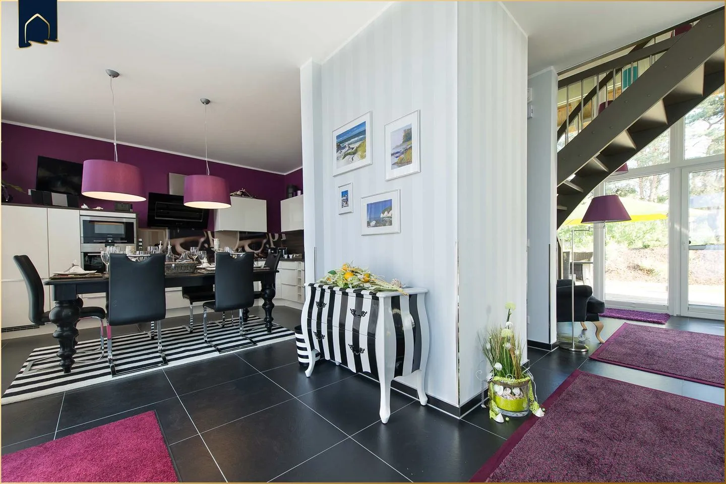 Die offene Designküche beeindruckt durch ihre moderne Ausstattung und ein elegantes Farbkonzept in kräftigem Violett, kombiniert mit glänzend weißen Fronten. Hochwertige Einbaugeräte von Siemens – darunter Backofen, Mikrowelle und Geschirrspüler – bieten alles, was anspruchsvolle Hobbyköche benötigen. Eine hochwertige Kaffeemaschine, Wasserkocher und Toaster stehen ebenfalls bereit.