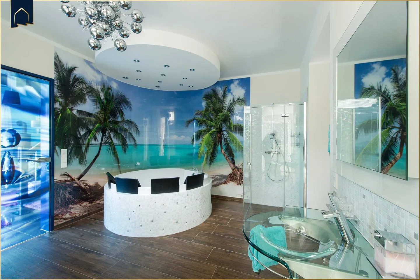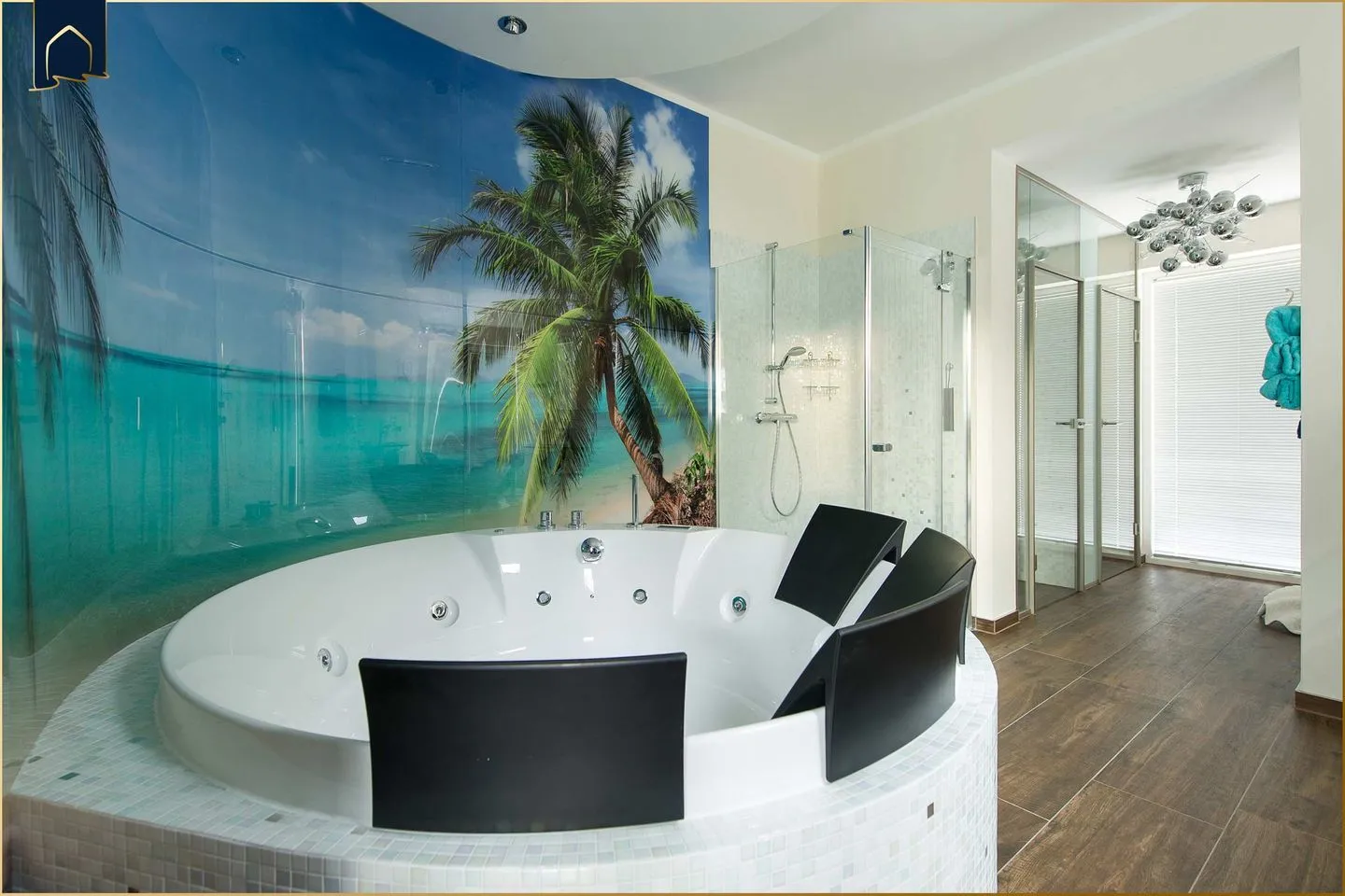 Dieses hochwertige Badezimmer bietet Ihnen eine exklusive Wellness-Oase – direkt im eigenen Ferienhaus. Der große Whirlpool mit Massagedüsen und komfortablen Nackenstützen lädt zum entspannten Baden ein. Die beeindruckende Fotowand mit tropischem Strandmotiv schafft ein einzigartiges Ambiente voller Urlaubsfeeling.
