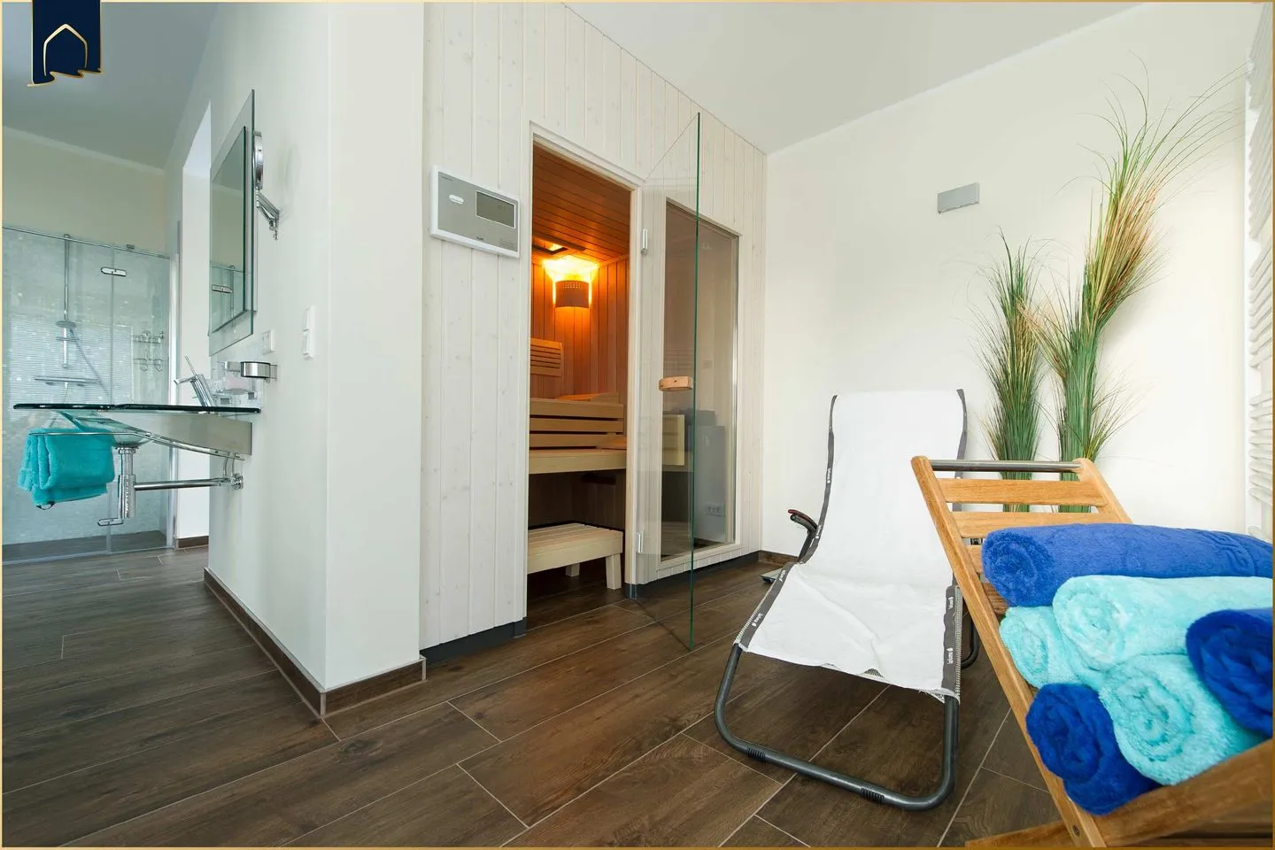 Für noch mehr Erholung sorgen die geräumige Glasdusche mit Regenduschkopf sowie eine angrenzende Dampfdusche, die Sie mit wohltuender Wärme und Feuchtigkeit verwöhnt. Ein echtes Highlight ist die private Sauna, die direkt an das Bad angrenzt. Hier können Sie ganz in Ruhe abschalten, die Wärme genießen und neue Energie tanken. Edle Materialien, stimmungsvolle Beleuchtung und liebevoll abgestimmte Details runden das luxuriöse Spa-Erlebnis ab – ganz ohne Wellnesshotel.