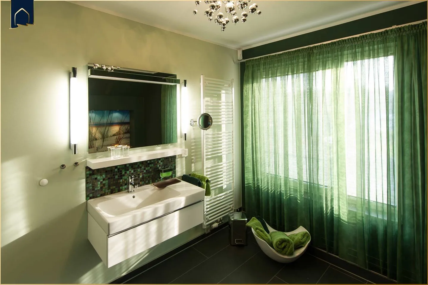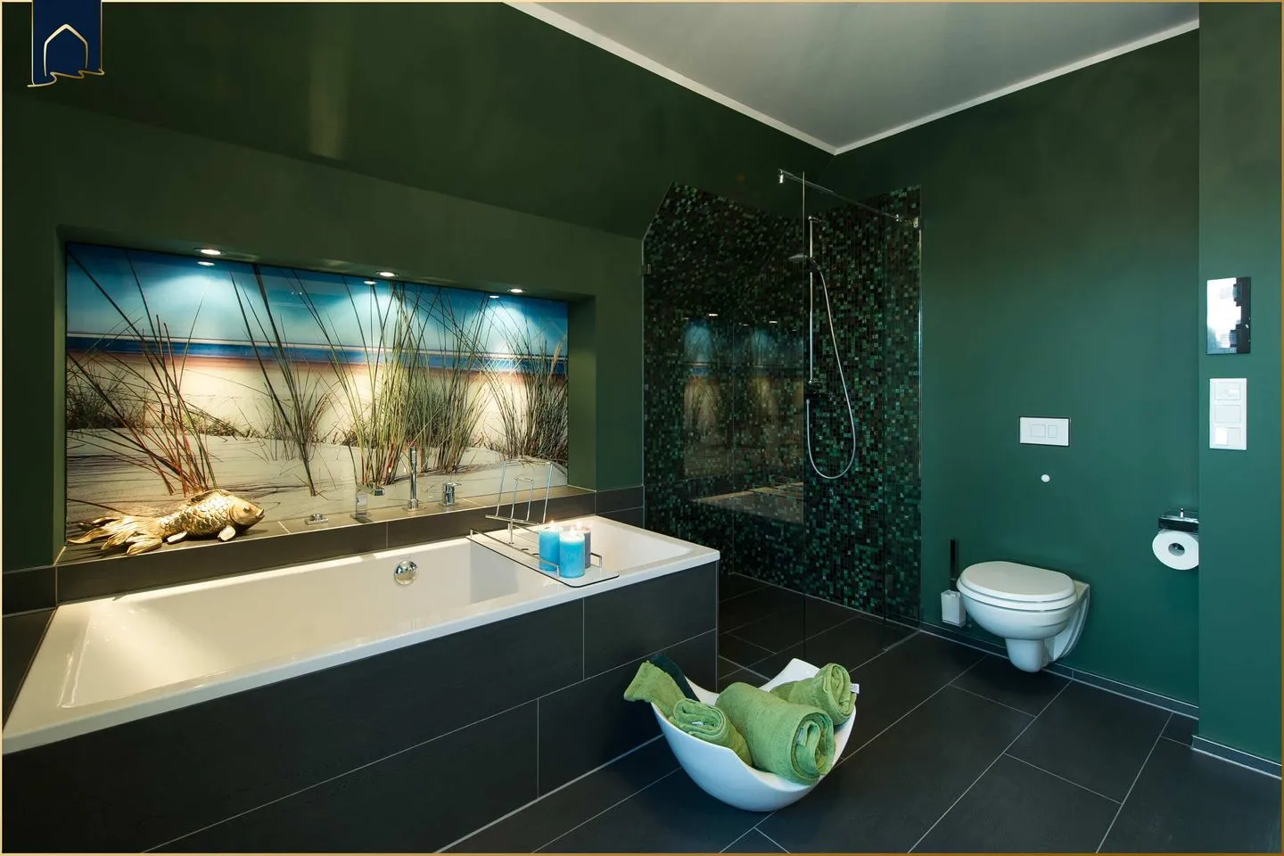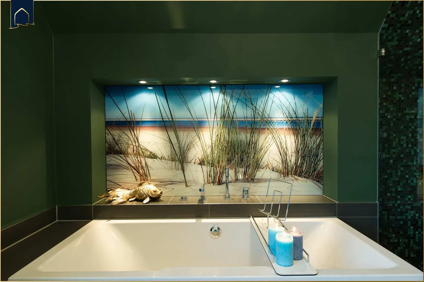 Dieses stilvoll gestaltete Badezimmer überzeugt mit seiner harmonischen Farbgebung in sattem Grün und einer Atmosphäre zum Wohlfühlen. Die elegante, in eine Wandnische integrierte Einbauwanne lädt mit stimmungsvoller Beleuchtung und einem maritimen Dünenmotiv zum Entspannen ein – perfekt für ruhige Momente nach einem Strandtag.