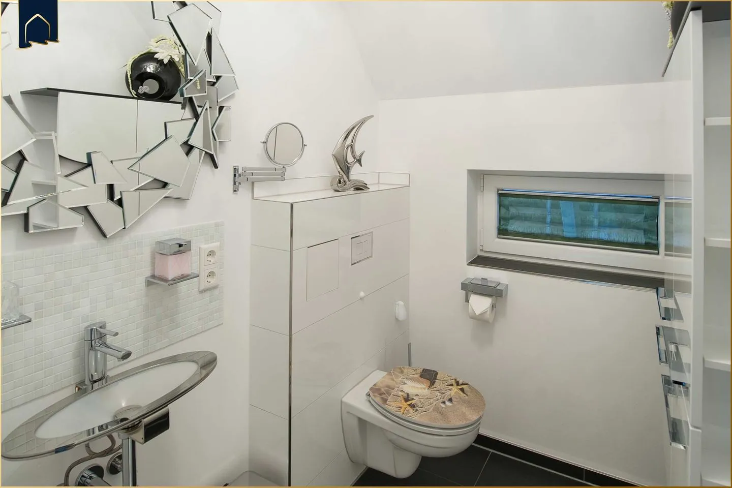 Die bodengleiche Dusche mit Regenduschkopf und Mosaikfliesen bietet zusätzlichen Komfort und verbindet modernes Design mit Funktionalität. Der großzügige Waschtisch mit Spiegel und seitlicher Beleuchtung sorgt für ein angenehmes Lichtbild am Morgen.