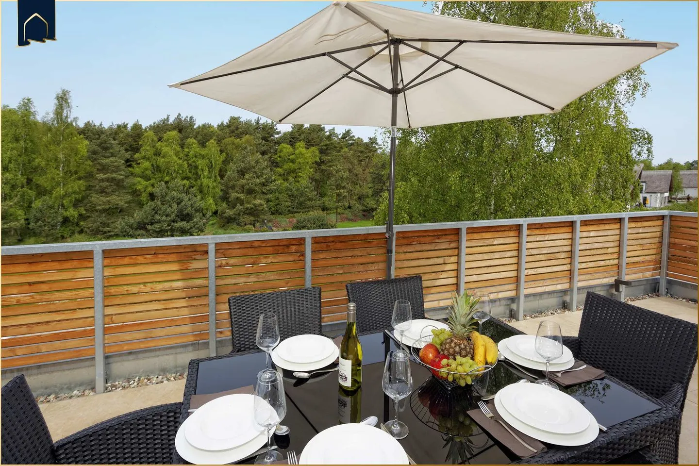 Ein besonderes Highlight sind die beiden Dachterrassen. Die größere Terrasse bietet einen wunderschönen freien Blick in den angrenzenden Mischwald und ist mit einer komfortablen Lounge, einem großen Esstisch und einem Grill ausgestattet – ideal für entspannte Sommerabende. Die kleinere, geschützte Terrasse bietet eine gemütliche Sitzgruppe und einen schönen Blick über die Dächer der Anlage sowie in den gemeinschaftlichen Garten.