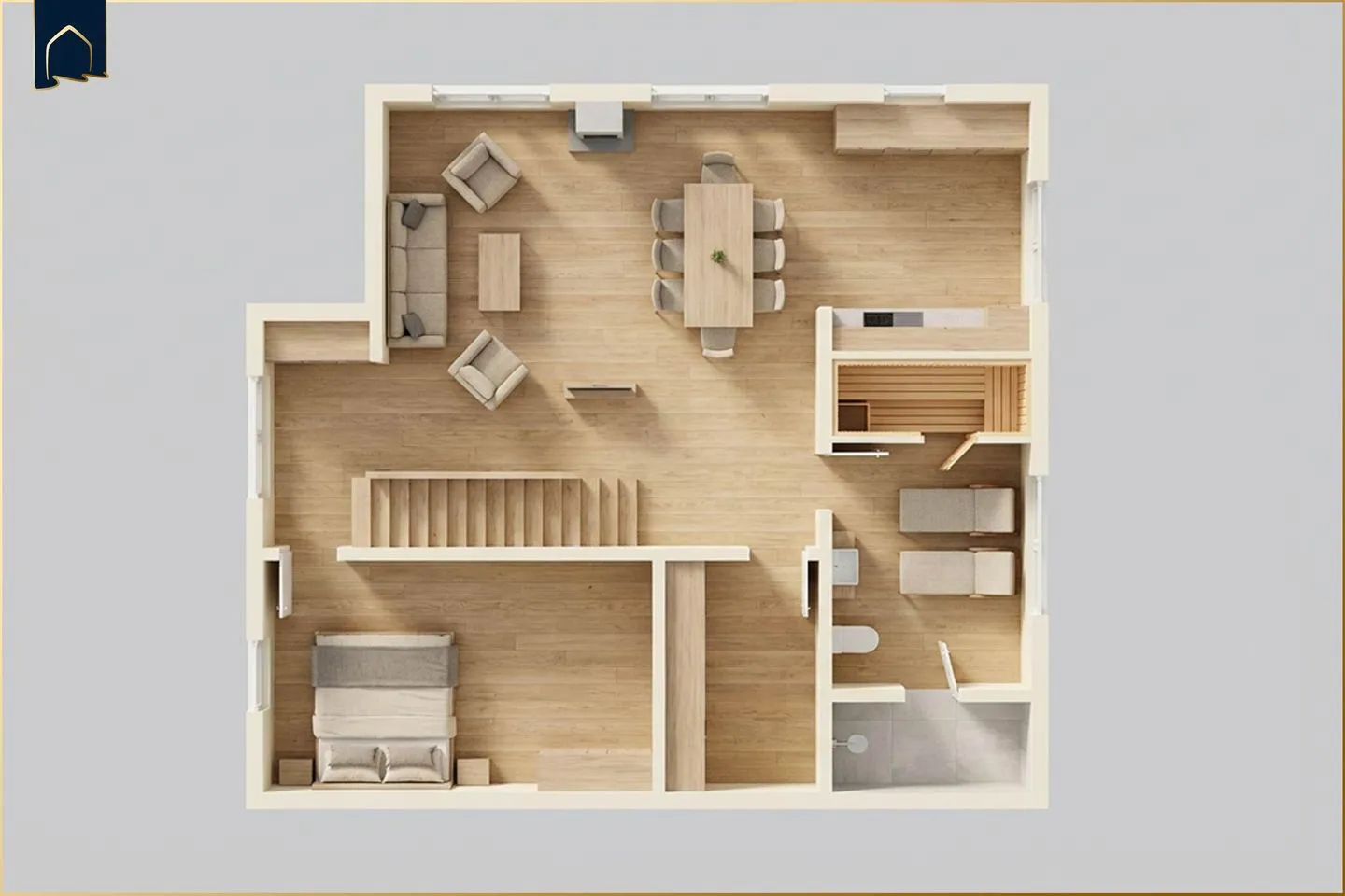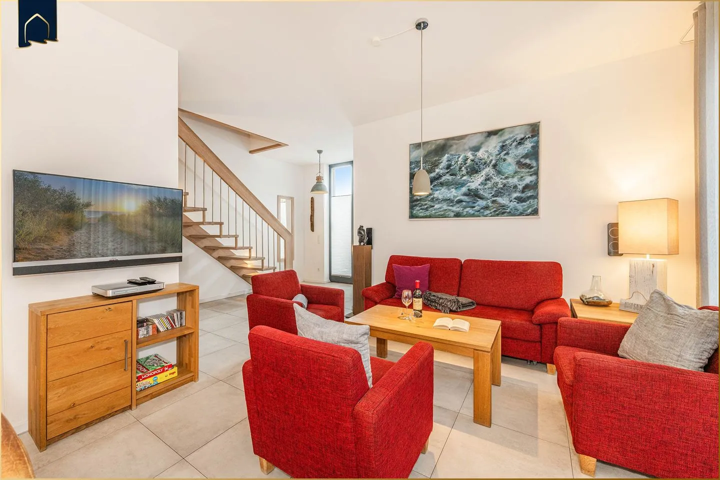 Im Inneren des Ferienhauses erwartet Sie ein großzügiger, offen gestalteter Wohn- und Essbereich mit viel Platz für gemeinsame Urlaubsstunden. Der Esstisch bietet ausreichend Raum für bis zu acht Personen und eignet sich perfekt für gesellige Abende. Ein Kamin sorgt an kühleren Tagen für eine besonders gemütliche Atmosphäre. Die moderne offene Küche ist umfassend ausgestattet und lässt keine Wünsche offen – ideal, um gemeinsam zu kochen und den Urlaub zu genießen. Für Unterhaltung sorgen mehrere Fernseher, eine Stereoanlage mit CD- und Blu-ray-Player sowie WLAN im gesamten Haus.