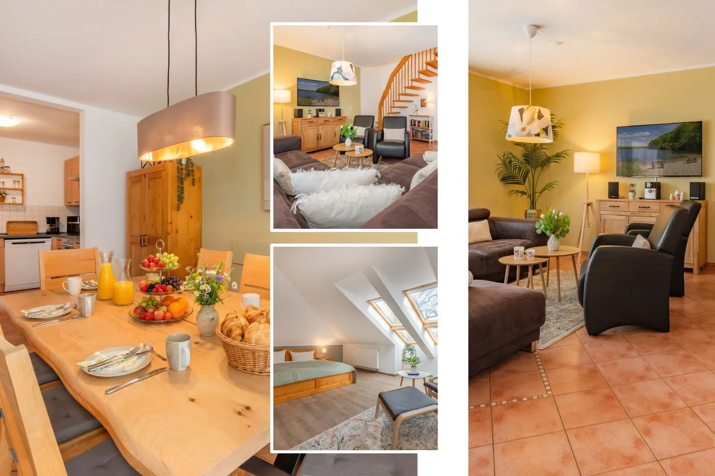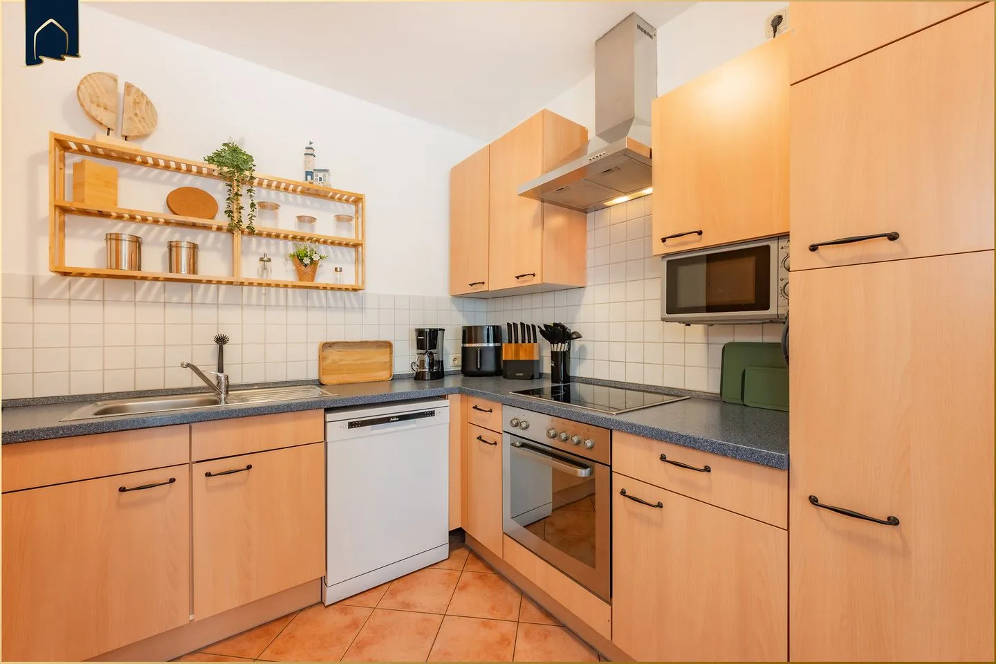 Die voll ausgestattete Küche bietet alles, was Sie für die Selbstverpflegung benötigen: Herd, Backofen, Mikrowelle, Kühlschrank mit Gefrierfach, Kaffeemaschine, Toaster sowie umfangreiche Küchenutensilien. Der angrenzende Essbereich lädt zu gemeinsamen Mahlzeiten ein. Im gemütlichen Wohnzimmer mit Sofa, Sesseln, TV und WLAN lassen sich entspannte Abende verbringen. Eine Fußbodenheizung sorgt dabei ganzjährig für angenehme Wärme.