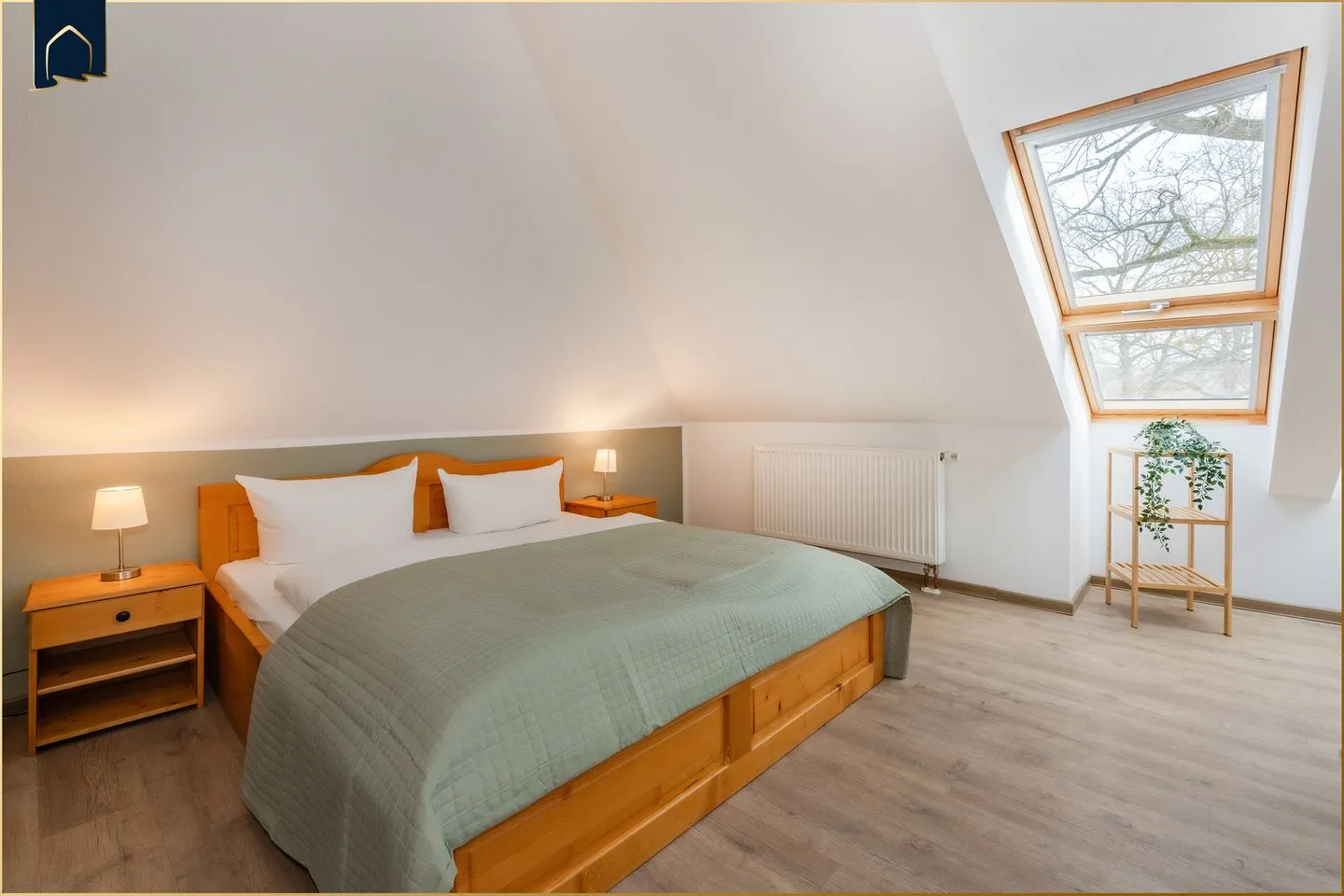 Insgesamt stehen vier Schlafzimmer, zwei Badezimmer mit Badewanne und Dusche sowie ein großzügiger Wohn- und Essbereich zur Verfügung. Große Fenster mit Sichtschutz sorgen für viel Tageslicht und gleichzeitig für Privatsphäre – ideal für Familien, die Wert auf Komfort und Rückzugsmöglichkeiten legen.