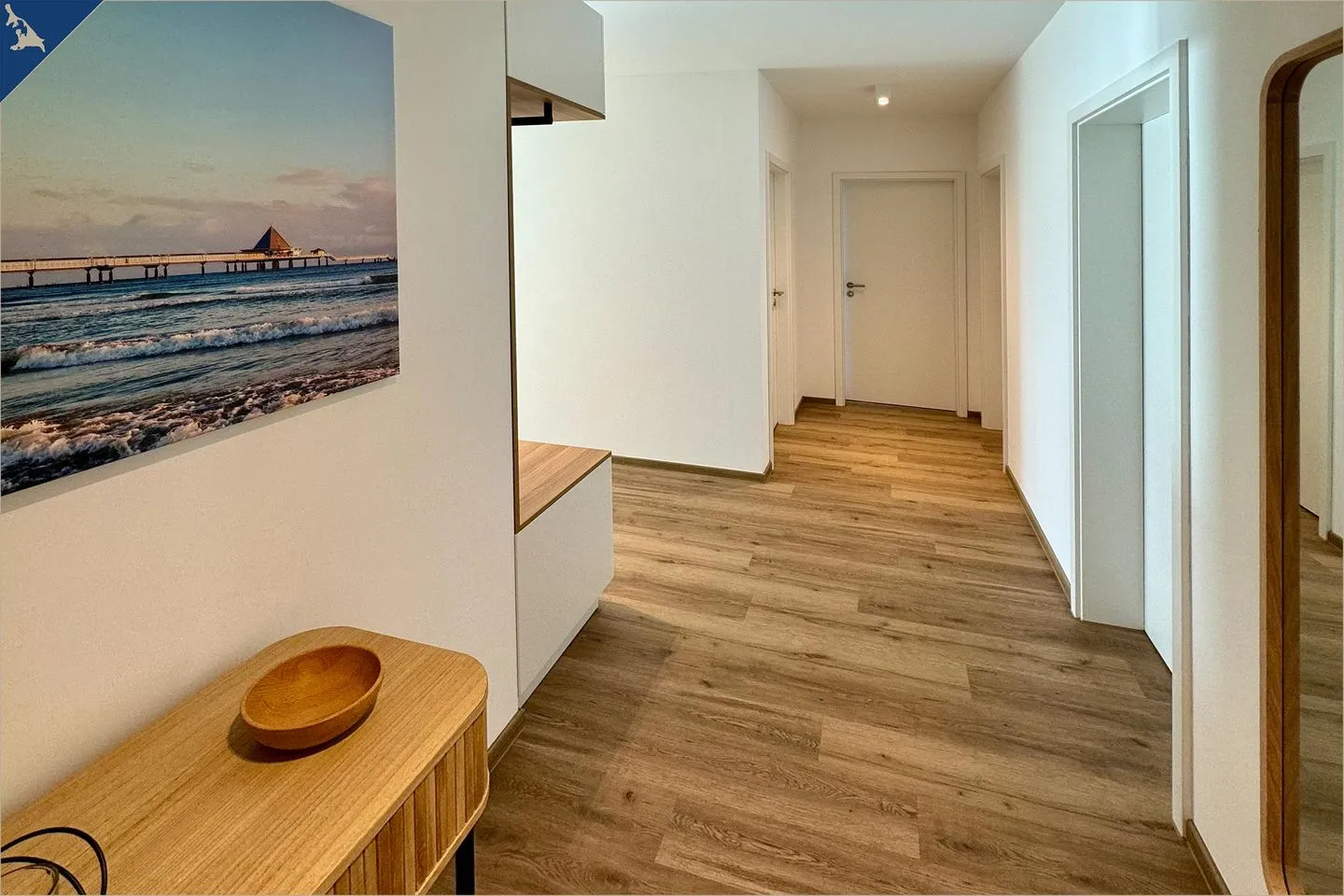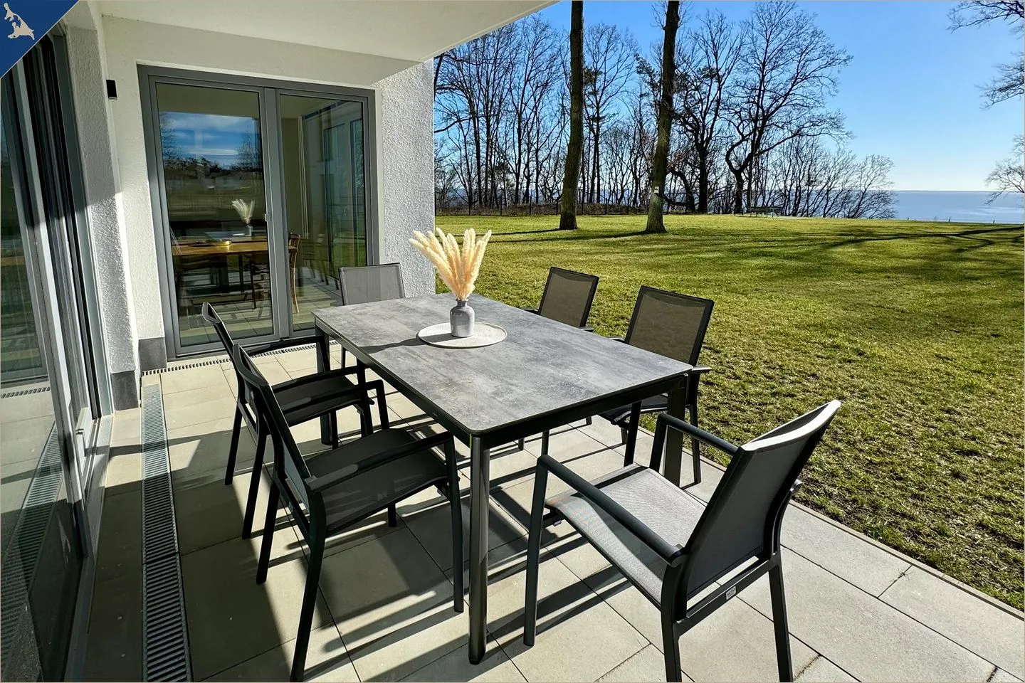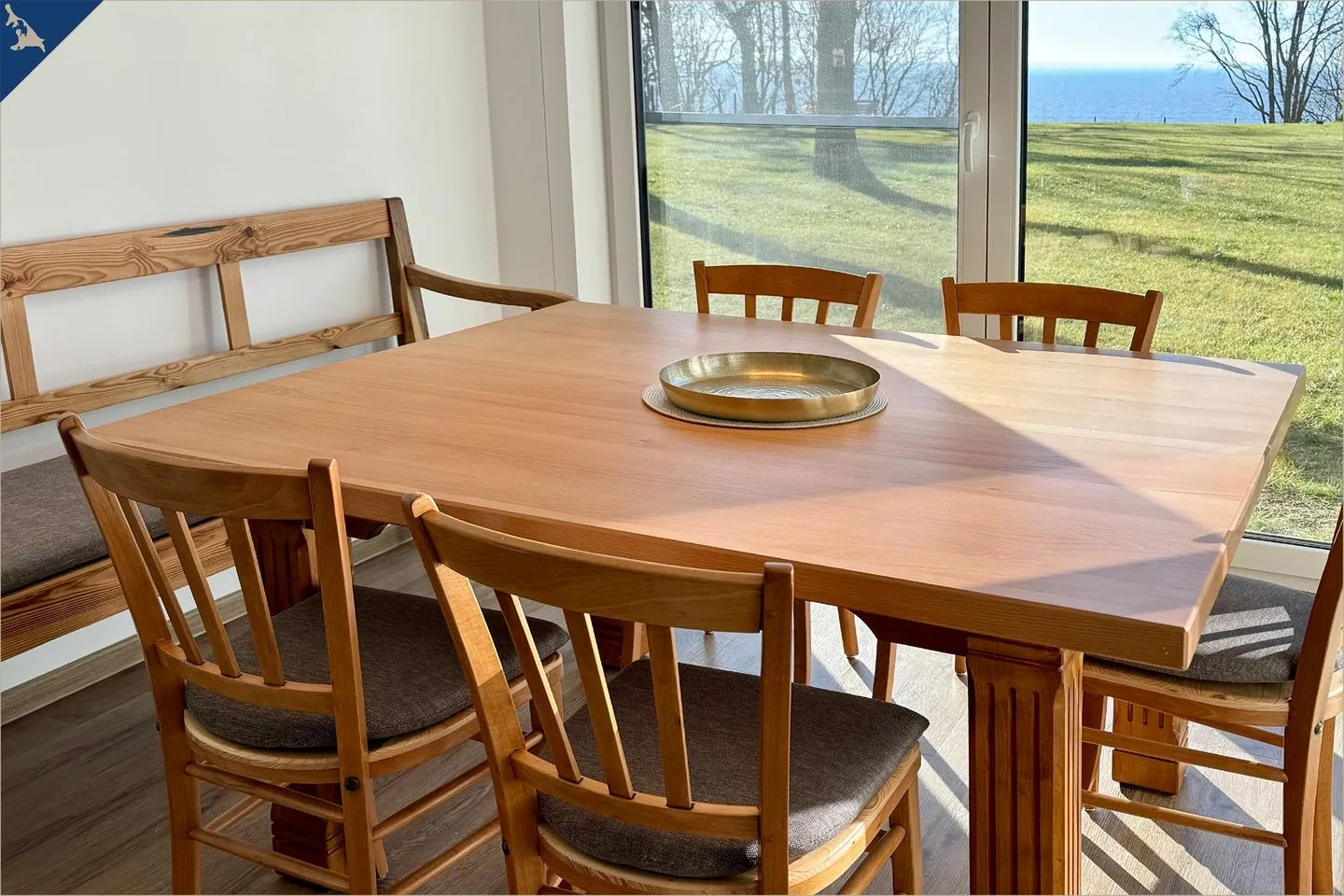 Willkommen in Ihrer neuen Ferienwohnung – einem stilvoll eingerichteten Rückzugsort inmitten der Natur, ideal für Familien, Paare oder Freunde. Die moderne 95 m² große Wohnung bietet Platz für bis zu fünf Personen und liegt nur wenige Kilometer vom See und rund 10 km vom Ostseestrand entfernt. Hier genießen Sie eine ruhige Lage mit traumhaftem Blick ins Grüne und auf das Wasser. Der großzügige Wohn- und Essbereich mit bequemer Sofaecke, Esstisch und Smart-TV lädt zum Verweilen ein. Große Fenster sorgen für viel Licht und Ausblick auf Garten und Landschaft – perfekt für alle, die Erholung und naturnahe Erlebnisse suchen.