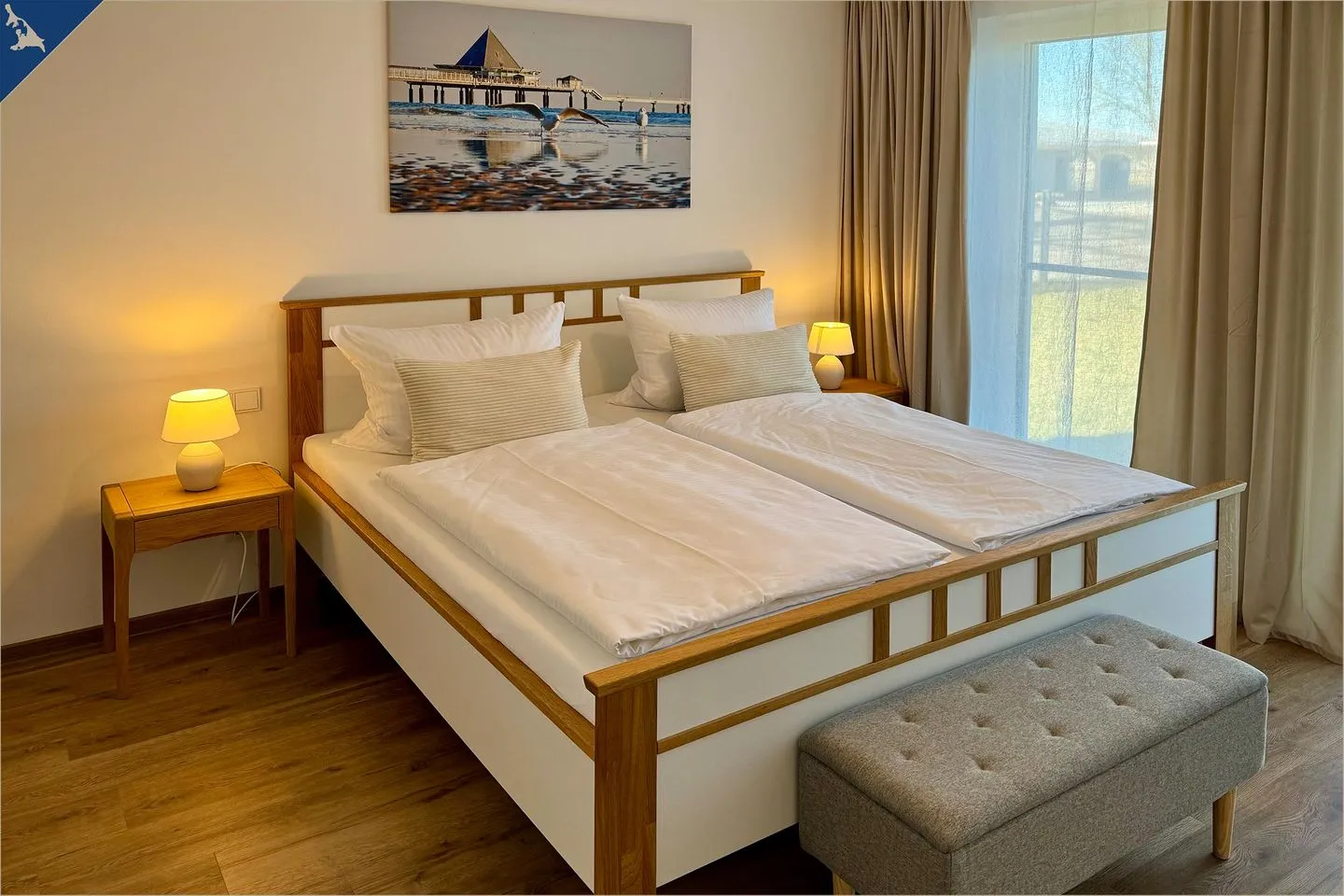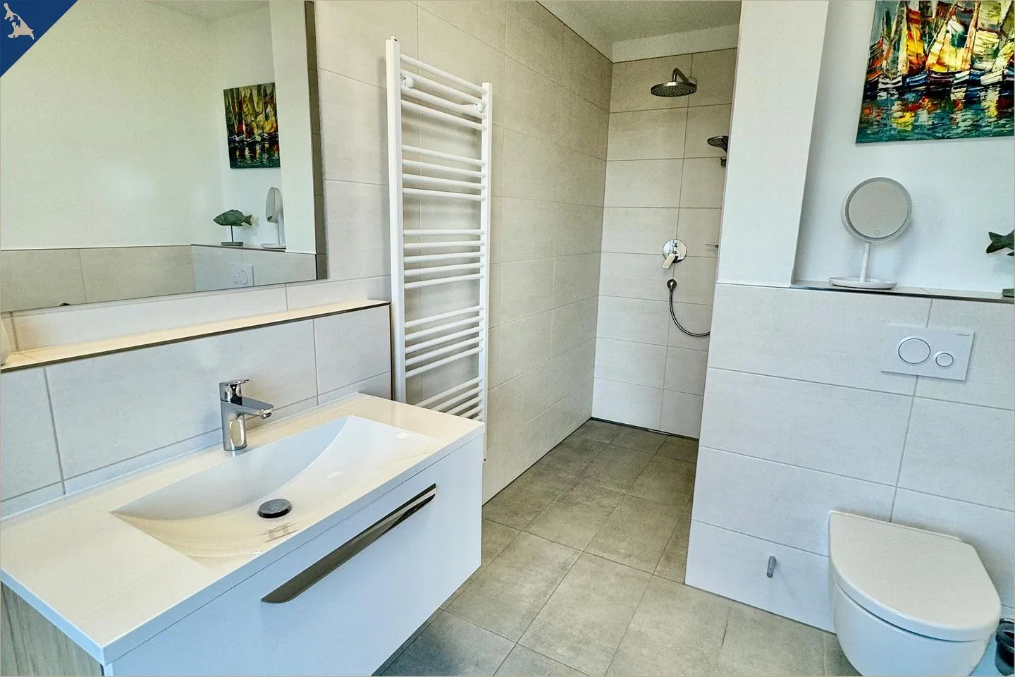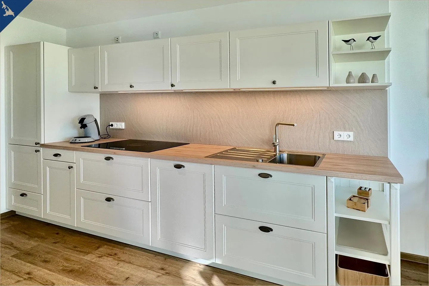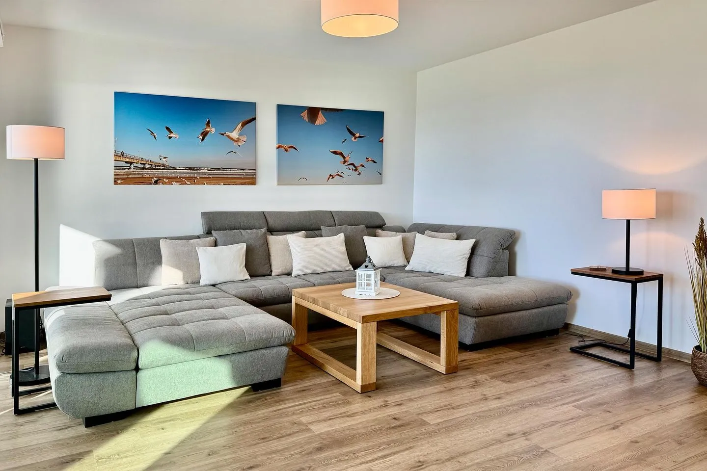 Willkommen in Ihrer neuen Ferienwohnung – einem stilvoll eingerichteten Rückzugsort inmitten der Natur, ideal für Familien, Paare oder Freunde. Die moderne 95 m² große Wohnung bietet Platz für bis zu fünf Personen und liegt nur wenige Kilometer vom See und rund 10 km vom Ostseestrand entfernt. Hier genießen Sie eine ruhige Lage mit traumhaftem Blick ins Grüne und auf das Wasser. Der großzügige Wohn- und Essbereich mit bequemer Sofaecke, Esstisch und Smart-TV lädt zum Verweilen ein. Große Fenster sorgen für viel Licht und Ausblick auf Garten und Landschaft – perfekt für alle, die Erholung und naturnahe Erlebnisse suchen.