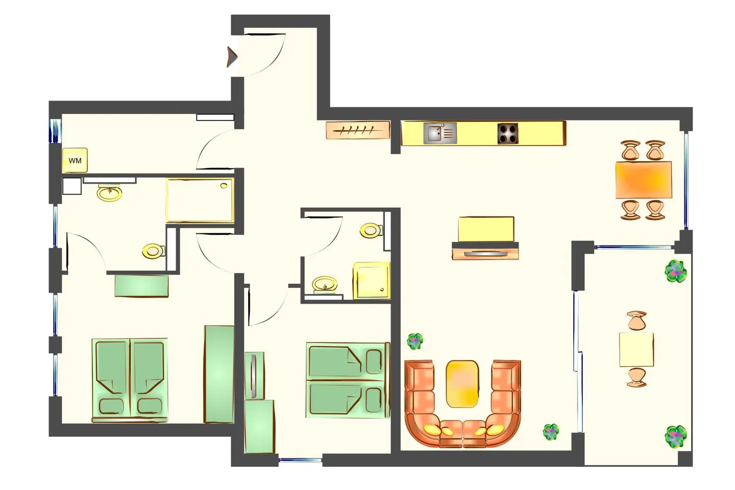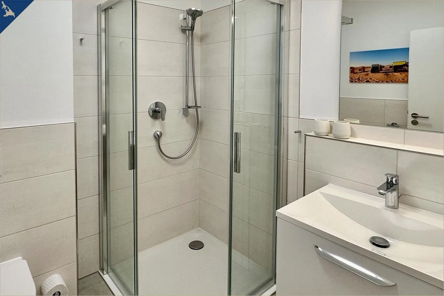 Die Unterkunft verfügt über zwei separate Schlafzimmer und zwei moderne Badezimmer mit Dusche – ideal für Familien mit Kindern oder gemeinsam reisende Paare. Die hochwertige Küche ist mit allem ausgestattet, was Sie für die Zubereitung von Mahlzeiten benötigen: Herd, Backofen, Mikrowelle, Kühlschrank mit Gefrierfach, Wasserkocher, Mixer, Toaster und sogar eine Espressomaschine. Zusätzlich stehen eine Waschmaschine, Trockner, Spülmaschine und Staubsauger zur Verfügung. Die Fußbodenheizung sorgt auch in der kühleren Jahreszeit für angenehme Wärme. Für Familien mit Kindern ist ein Spielplatz in der Nähe, Fliegengitter und Sichtschutz an allen Fenstern bieten zusätzliche Sicherheit und Komfort.