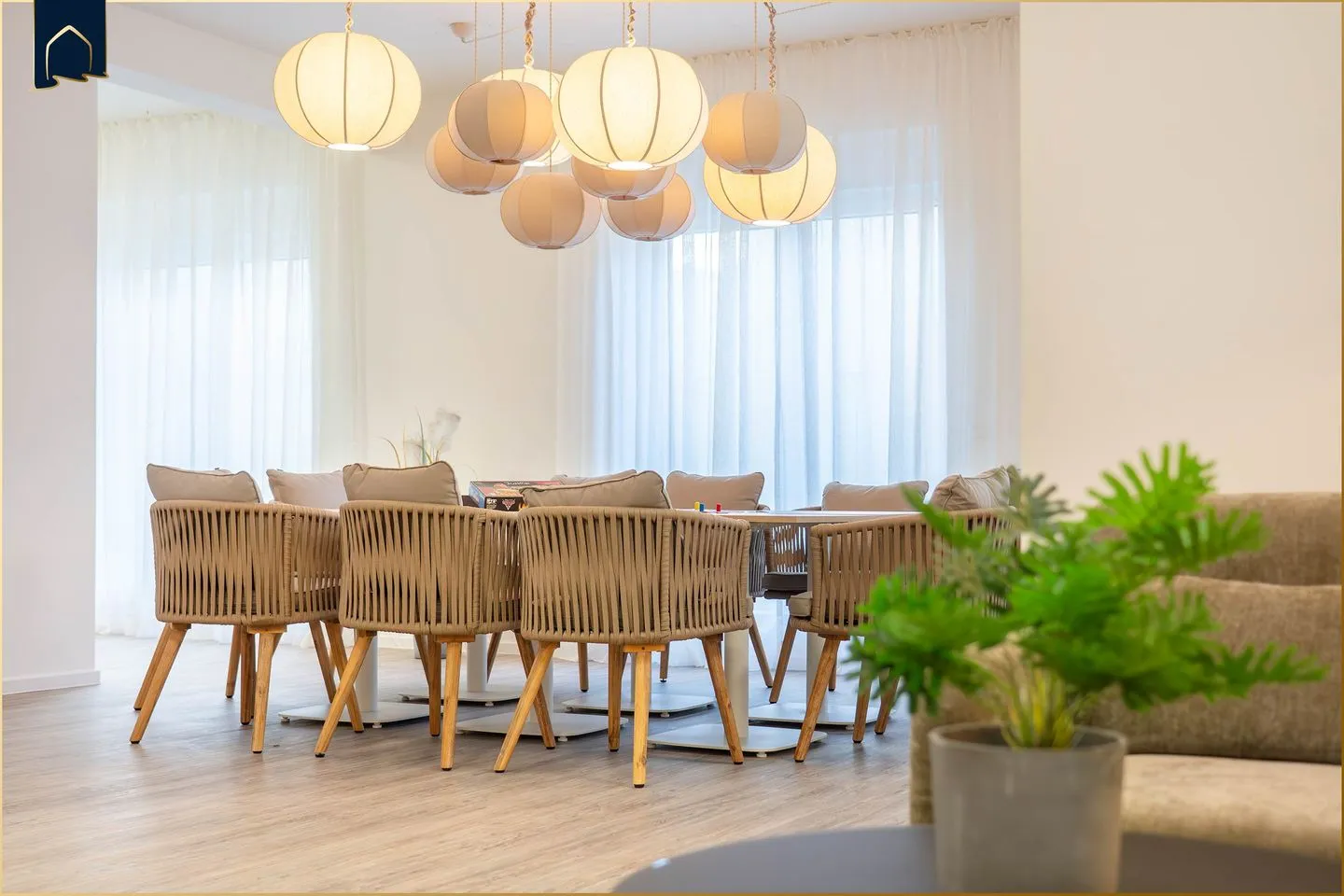 Der Wohnbereich ist hell und freundlich gestaltet, mit einer Sofaecke, die zum Verweilen und Entspannen einlädt. Genießen Sie auch die Unterhaltungsmöglichkeiten, die zwei Fernseher (35-44 Zoll) und WLAN umfassen. Stauraum ist ebenfalls ausreichend vorhanden, mit Einrichtungen wie einem Schuhschrank und einer Garderobe. Zudem ist die Unterkunft auch auf Familien eingestellt: Hochstühle und Babybetten stehen für die kleinen Gäste bereit.