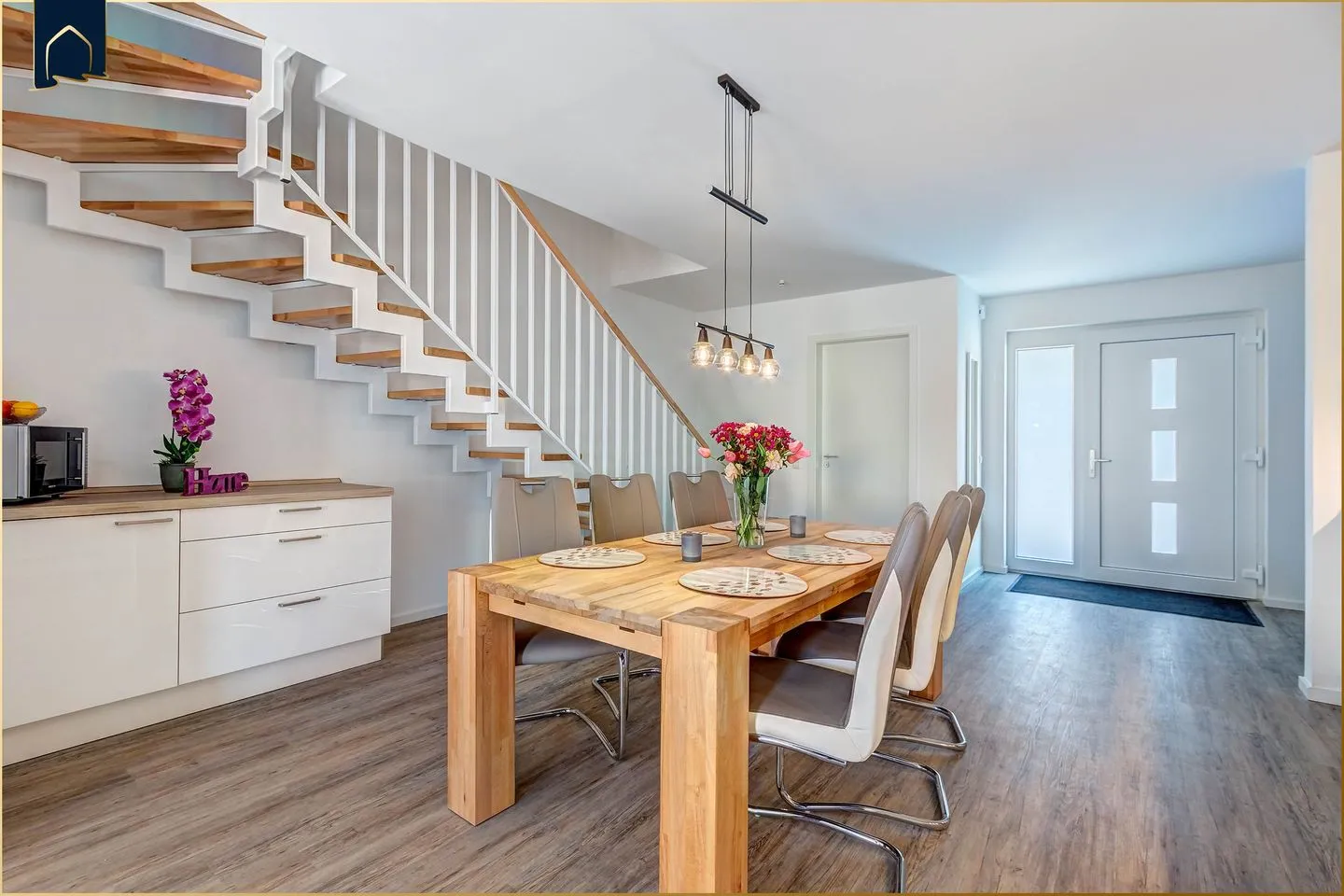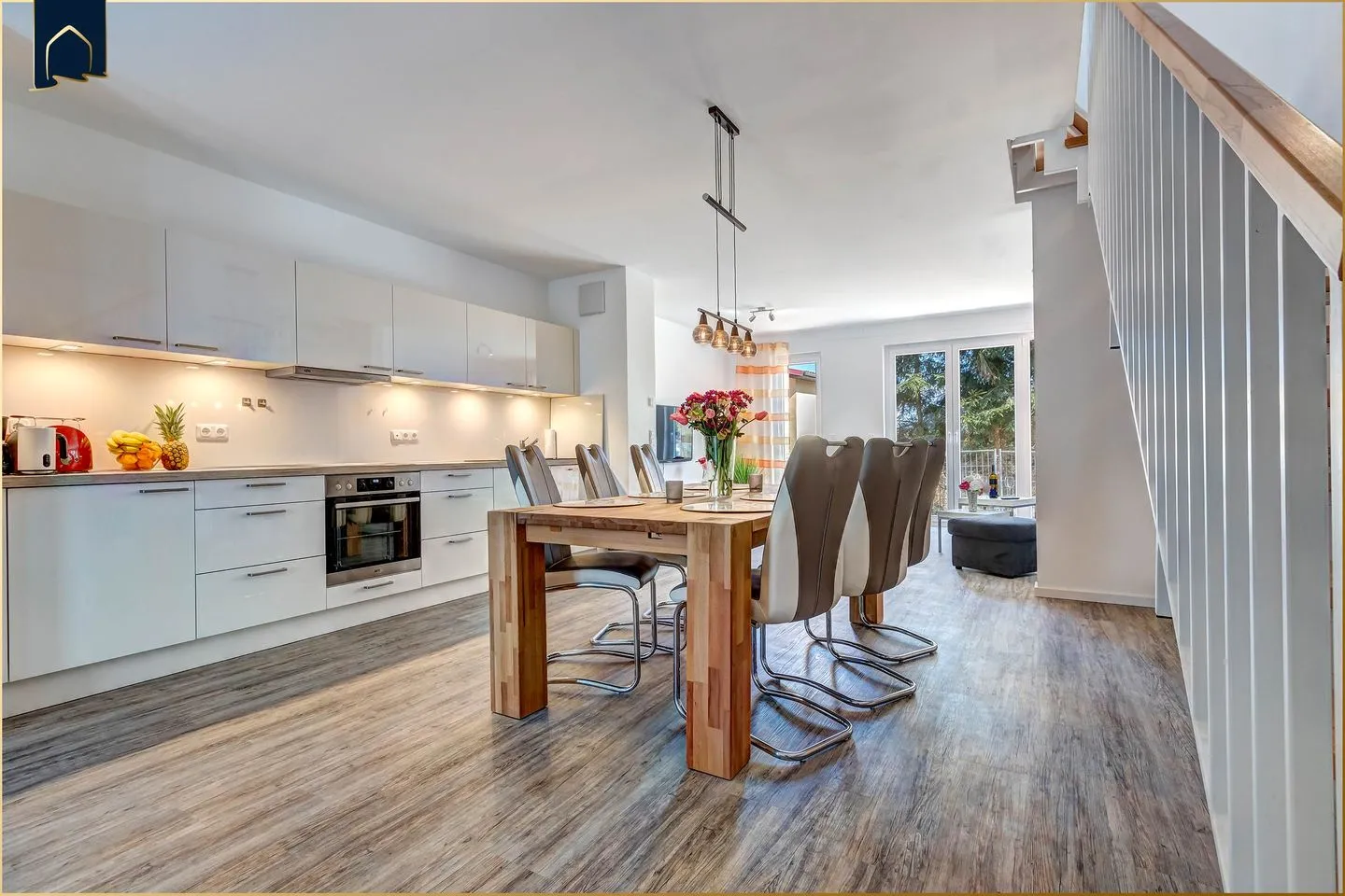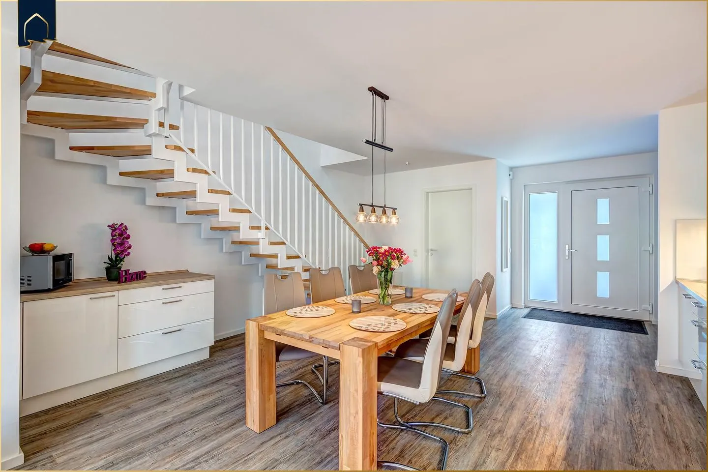 Die offene Wohnküche mit Ceranherd, Spülmaschine, Kaffeemaschine und vielem mehr lässt keine Wünsche offen und ist bestens ausgestattet, um gemeinsam zu kochen und zu genießen. Der große Esstisch lädt zu ausgedehnten Mahlzeiten mit der Familie ein. Im Erdgeschoss befindet sich zudem eines der beiden modernen Bäder mit bodengleicher Dusche.