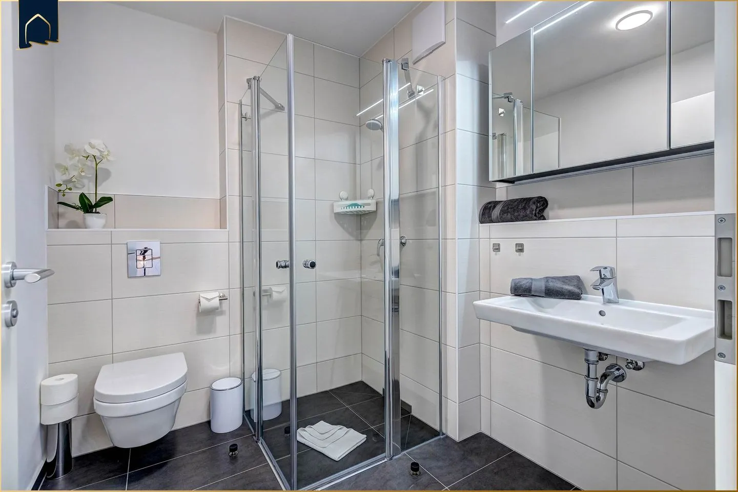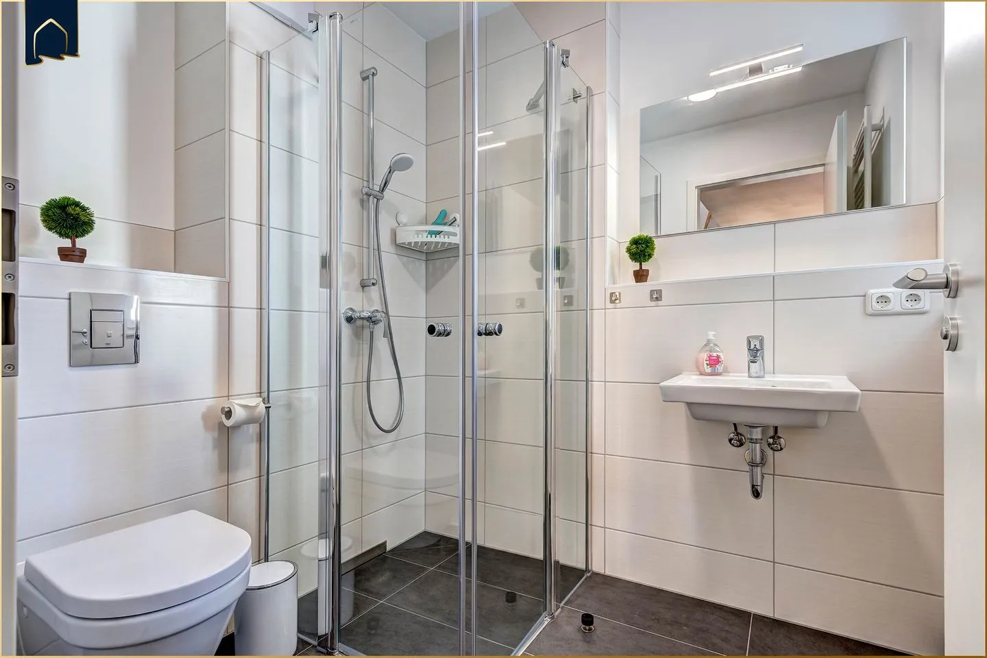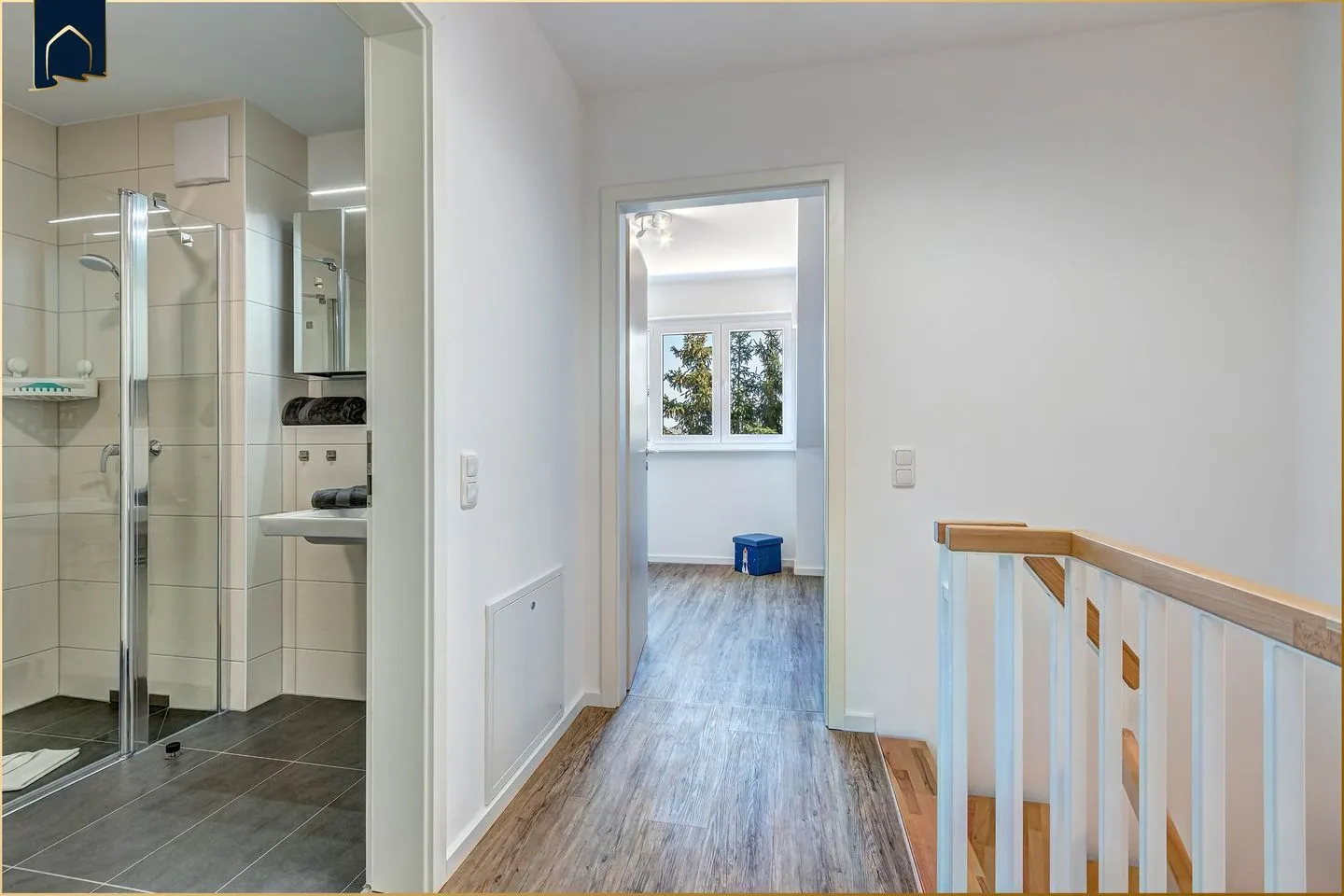 Die offene Wohnküche mit Ceranherd, Spülmaschine, Kaffeemaschine und vielem mehr lässt keine Wünsche offen und ist bestens ausgestattet, um gemeinsam zu kochen und zu genießen. Der große Esstisch lädt zu ausgedehnten Mahlzeiten mit der Familie ein. Im Erdgeschoss befindet sich zudem eines der beiden modernen Bäder mit bodengleicher Dusche.