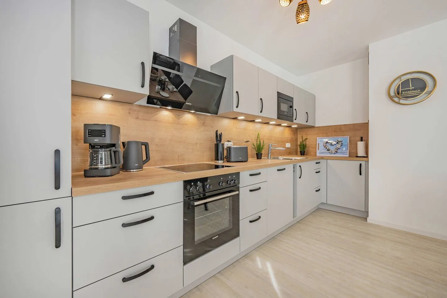 Die Wohnung befindet sich in einem modernen Gebäude mit Aufzug und bietet alles, was das Herz begehrt: Zwei separate Schlafzimmer sorgen für erholsamen Schlaf, während zwei stilvoll ausgestattete Badezimmer mit Duschen viel Privatsphäre garantieren – perfekt für einen entspannten Start in den Urlaubstag. Die offene Wohnküche mit Esstisch und Sofaecke ist das kommunikative Zentrum der Wohnung und lädt zu geselligen Stunden ein. Hochwertige Geräte wie Backofen, Herd, Mikrowelle, Kühlschrank mit Gefrierfach, Kaffeemaschine, Wasserkocher, Toaster und eine Spülmaschine machen die Selbstversorgung zum Kinderspiel.