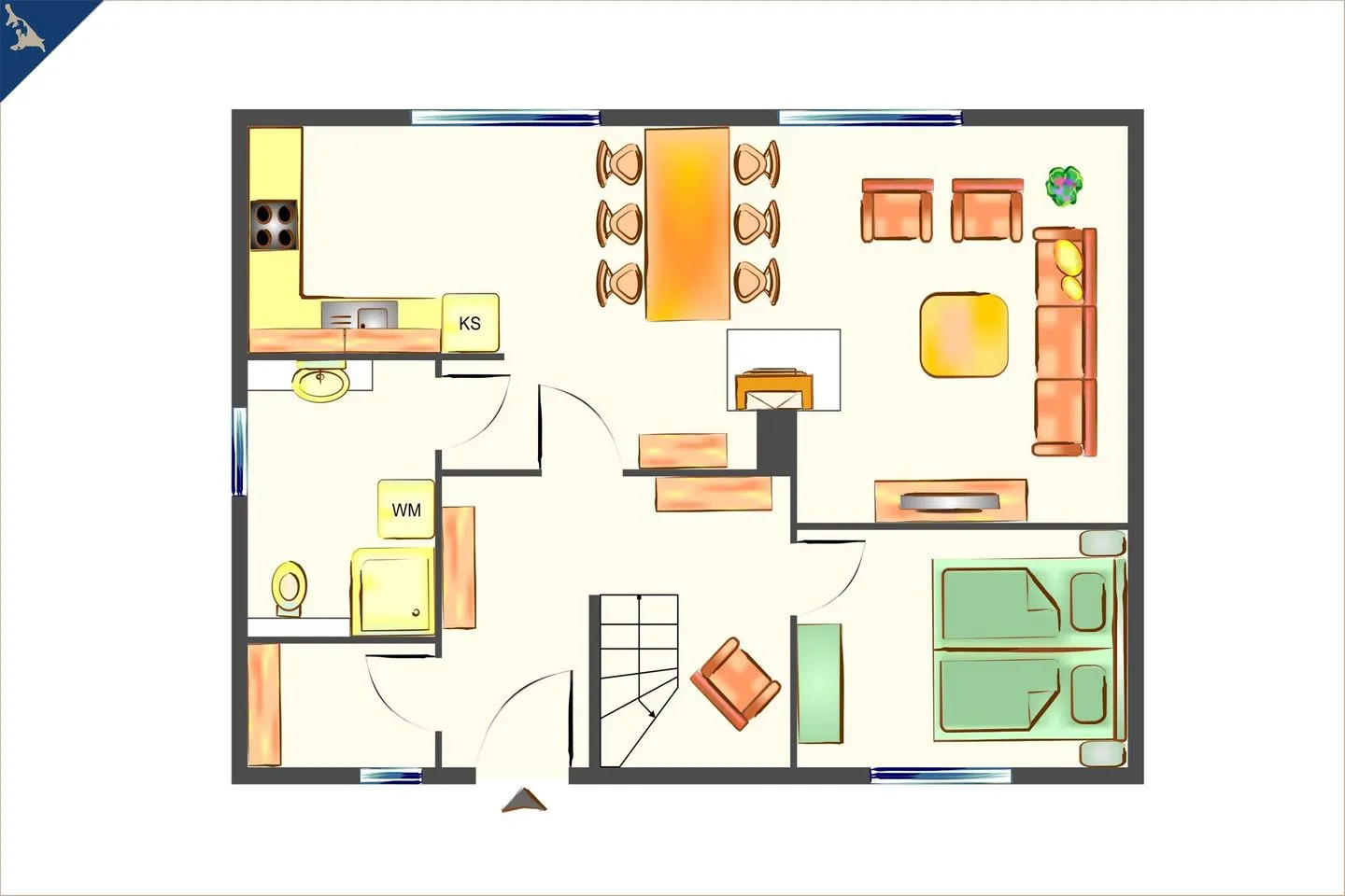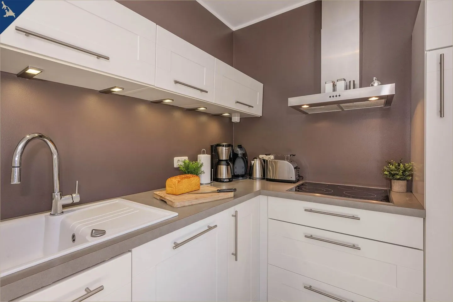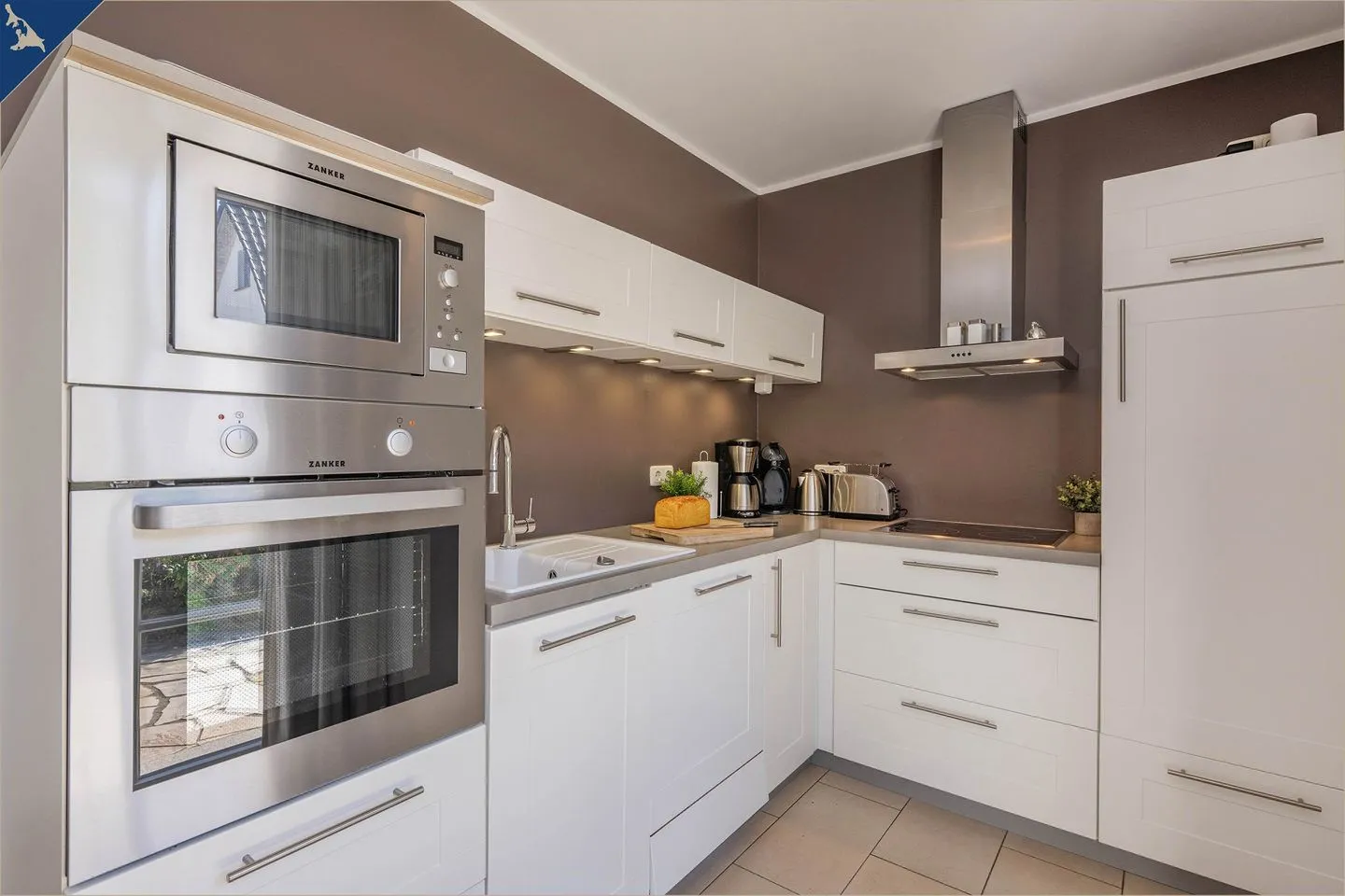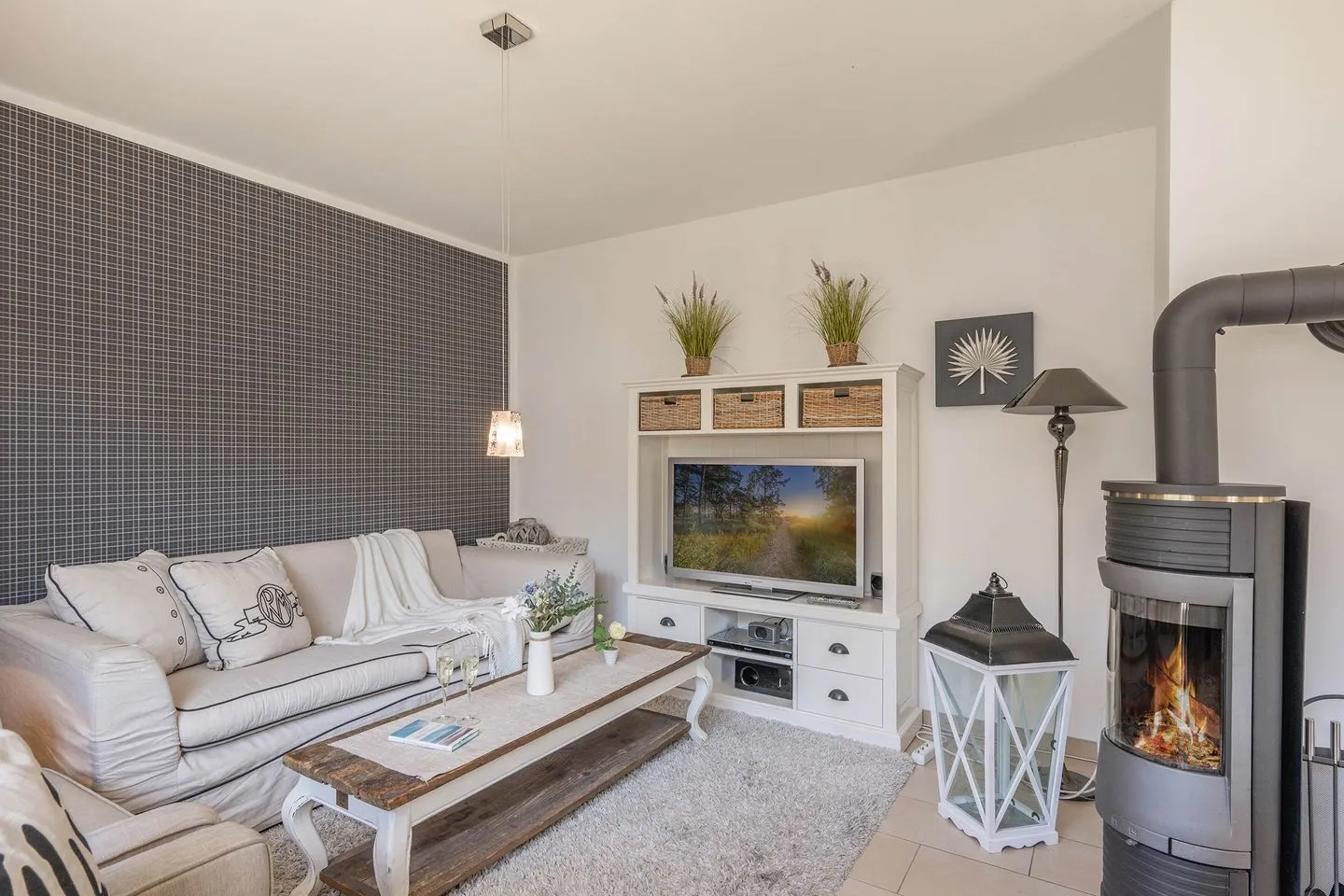 Die voll ausgestattete Küche mit Backofen, Herd, Mikrowelle, Kaffeemaschine, Espressomaschine, Spülmaschine, Gefrierschrank und allen wichtigen Küchenutensilien lässt keine Wünsche offen. Ein geräumiger Essbereich lädt zum gemeinsamen Genießen ein. Im Wohnzimmer sorgen ein Kaminofen, gemütliche Sitzmöbel und ein großer digitaler TV für entspannte Abende.