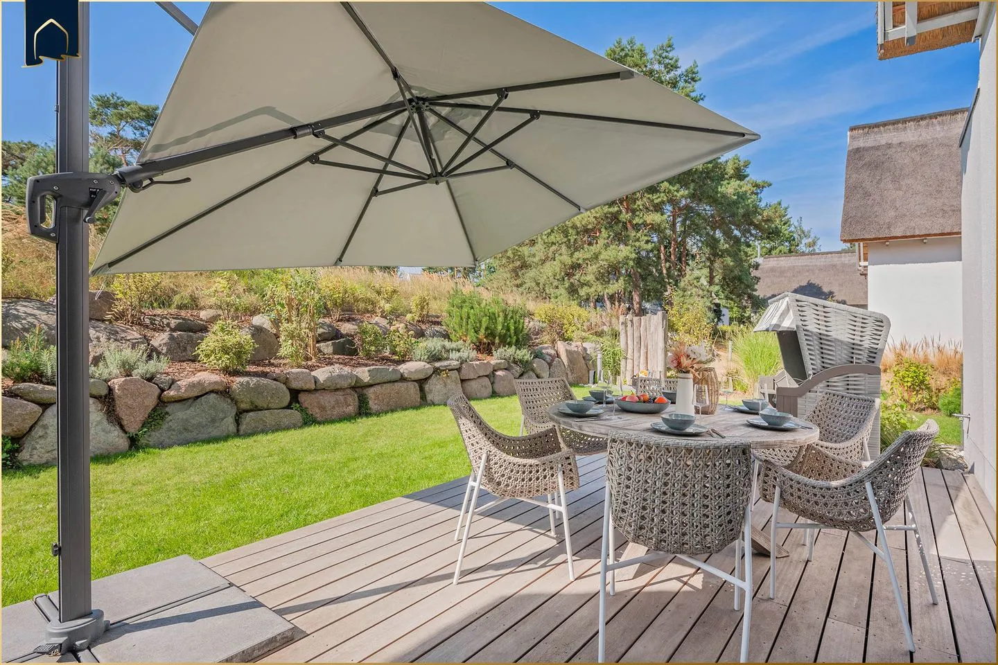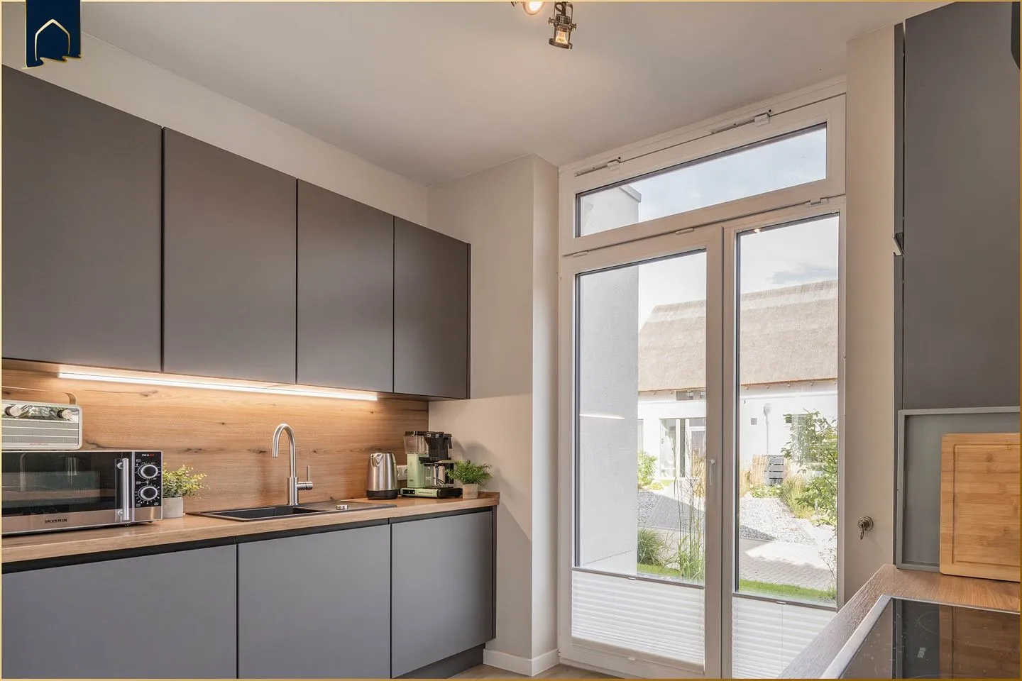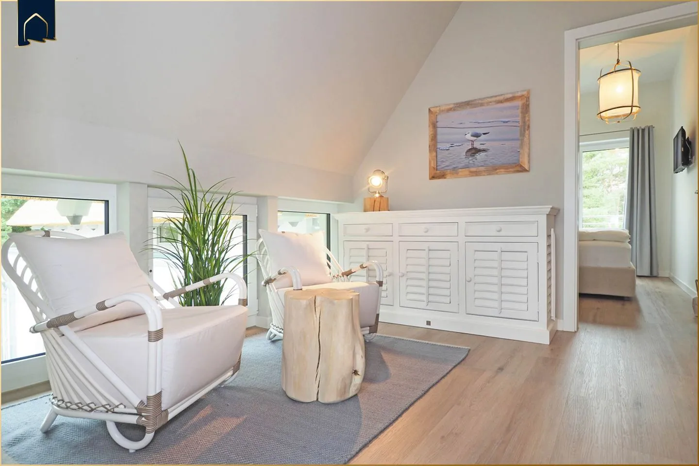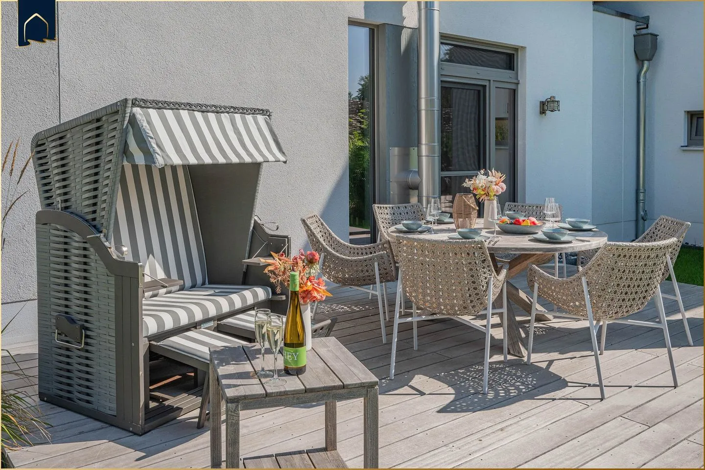 In dem lichtdurchfluteten Wohn- und Essbereich mit offenem Kamin, gemütlicher Sofalandschaft und direktem Zugang zur großen Holzterrasse mit Garten fühlt man sich sofort wohl. Die offene Designküche ist voll ausgestattet und lädt zum gemeinsamen Kochen und Genießen ein – ob schnelles Frühstück oder ausgedehntes Dinner. Draußen erwarten Sie Loungemöbel, ein Strandkorb und ein Elektrogrill – perfekt für entspannte Abende in der Sonne oder unter den Sternen.