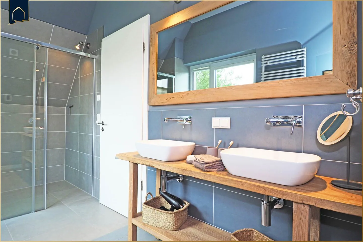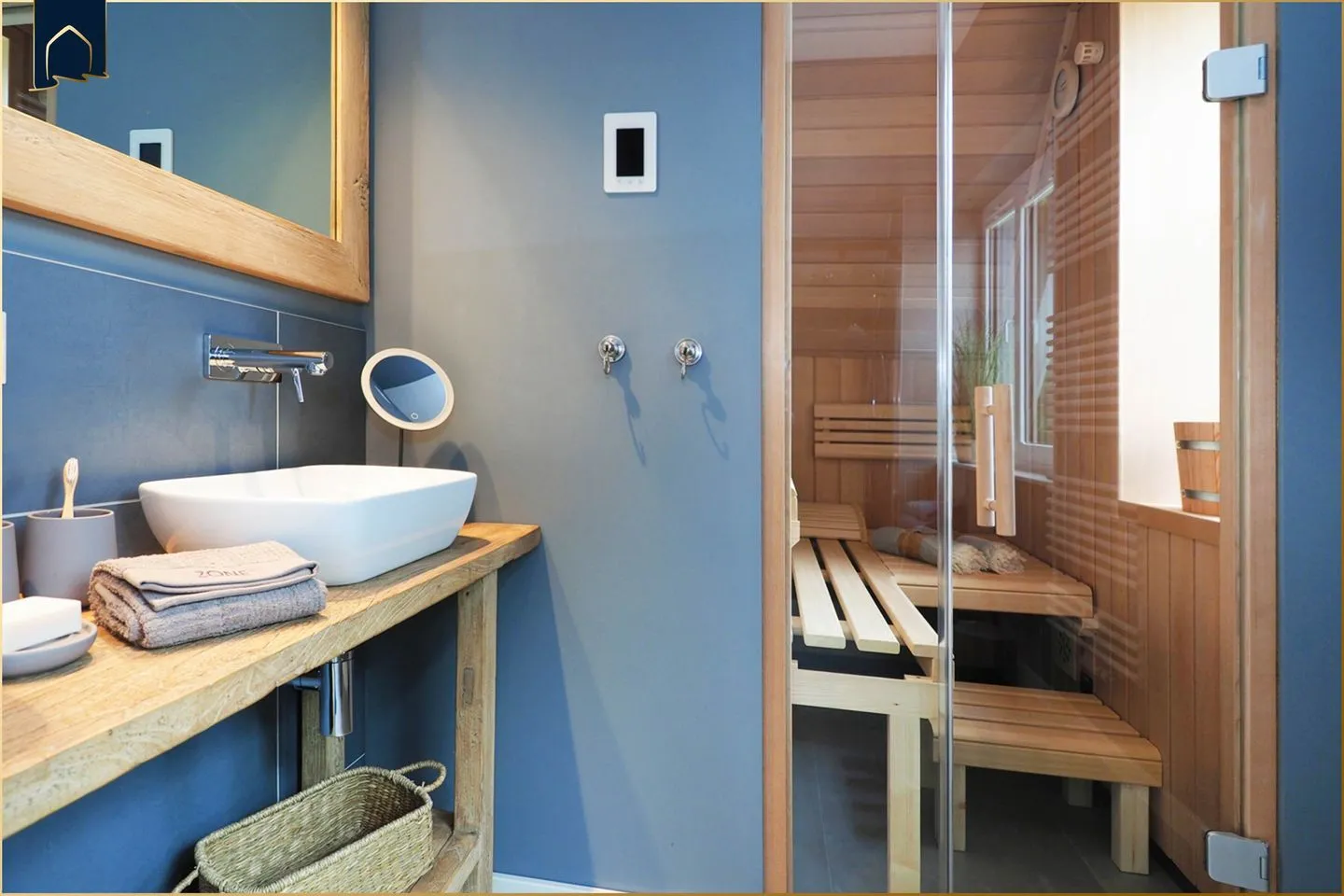 Zwei moderne Badezimmer mit bodengleichen Walk-in-Duschen, eines davon mit Doppelwaschtisch und eigener Sauna, sowie ein zusätzliches Gäste-WC sorgen für den gewissen Luxus. Für den Alltag ist ebenfalls gesorgt: Waschmaschine, WLAN und zwei Parkplätze direkt am Haus stehen Ihnen zur Verfügung.