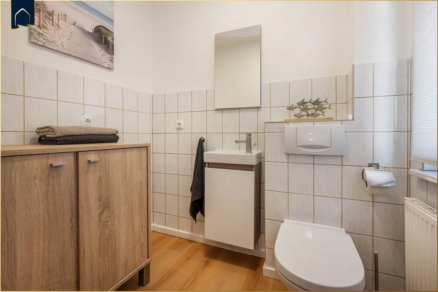 Das Ferienhaus verfügt über zwei gemütliche Schlafzimmer mit bequemen Betten und ausreichend Stauraum. Im Wohnbereich lädt ein großes Sofa zum Entspannen ein, ergänzt durch einen Smart-TV und eine kleine Auswahl an Büchern und Brettspielen. Die voll ausgestattete Küche mit Spülmaschine, Backofen, Herd, Kühlschrank mit Gefrierfach, Kaffeemaschine, Wasserkocher und Toaster lässt keine Wünsche offen. Ein modernes Badezimmer mit Dusche sowie ein zusätzliches Gäste-WC sorgen für extra Komfort.