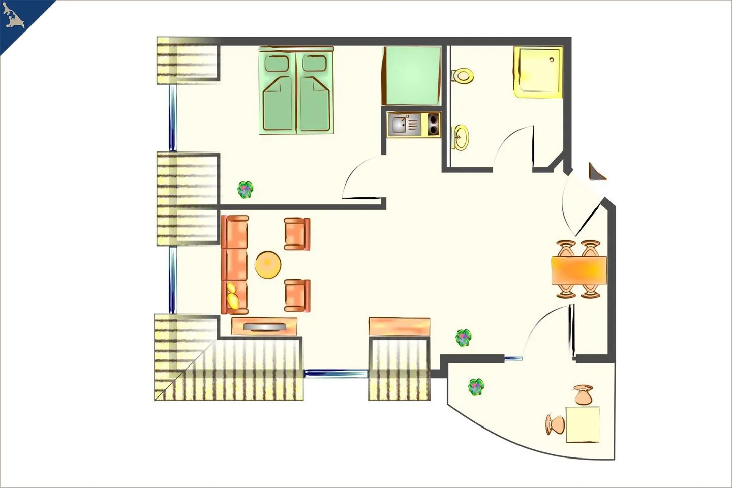 Schönes kleines Appartement, Gastronomie und Strand fußläufig zu erreichen.
