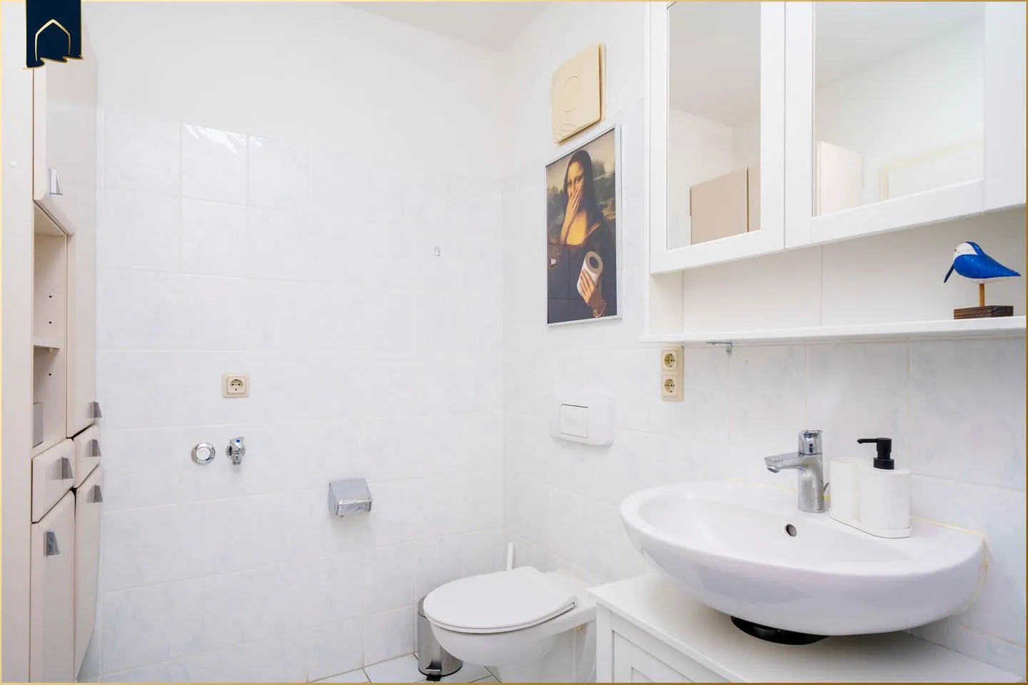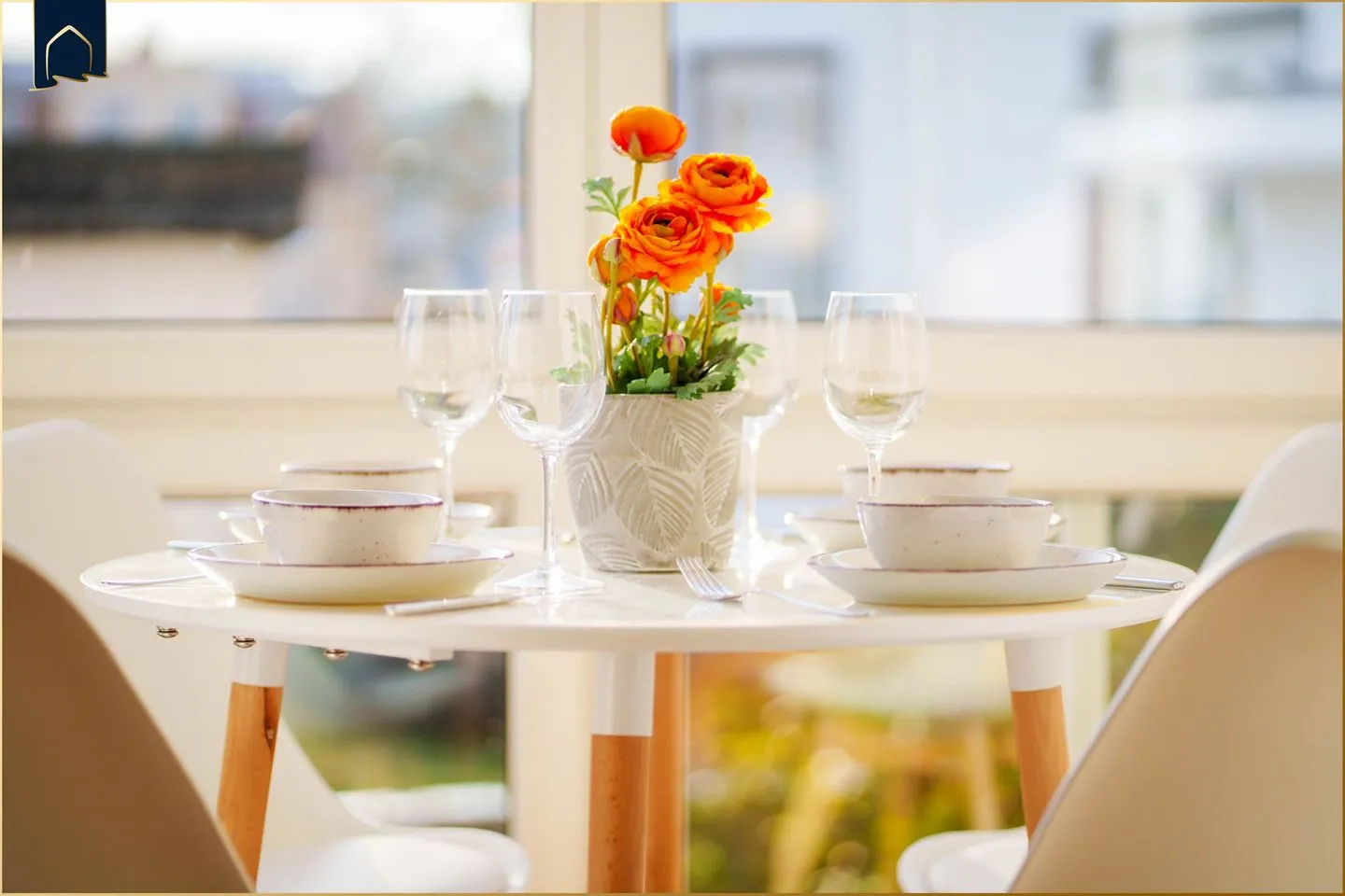 Die offene Küche ist vollständig eingerichtet und bietet alles, was das Kochherz begehrt: Cerankochfeld, Spülmaschine, Kühlschrank mit Gefrierfach, Kaffeemaschine, Wasserkocher, Toaster – und statt eines klassischen Backofens gibt’s hier ganz modern einen Airfryer, der Ihre Mahlzeiten in Windeseile knusprig zaubert. Im angrenzenden Essbereich genießen Sie Ihre Gerichte in gemütlicher Runde. Das Badezimmer überzeugt mit Dusche, Haartrockner und einem Kosmetikspiegel. Für kleine Gäste stehen Hochstuhl und Babybett kostenfrei bereit, Kinderbettwäsche kann für 9,90 € hinzugebucht werden. Ein CD-Radio bringt auf Wunsch musikalische Retro-Vibes ins Urlaubsambiente.