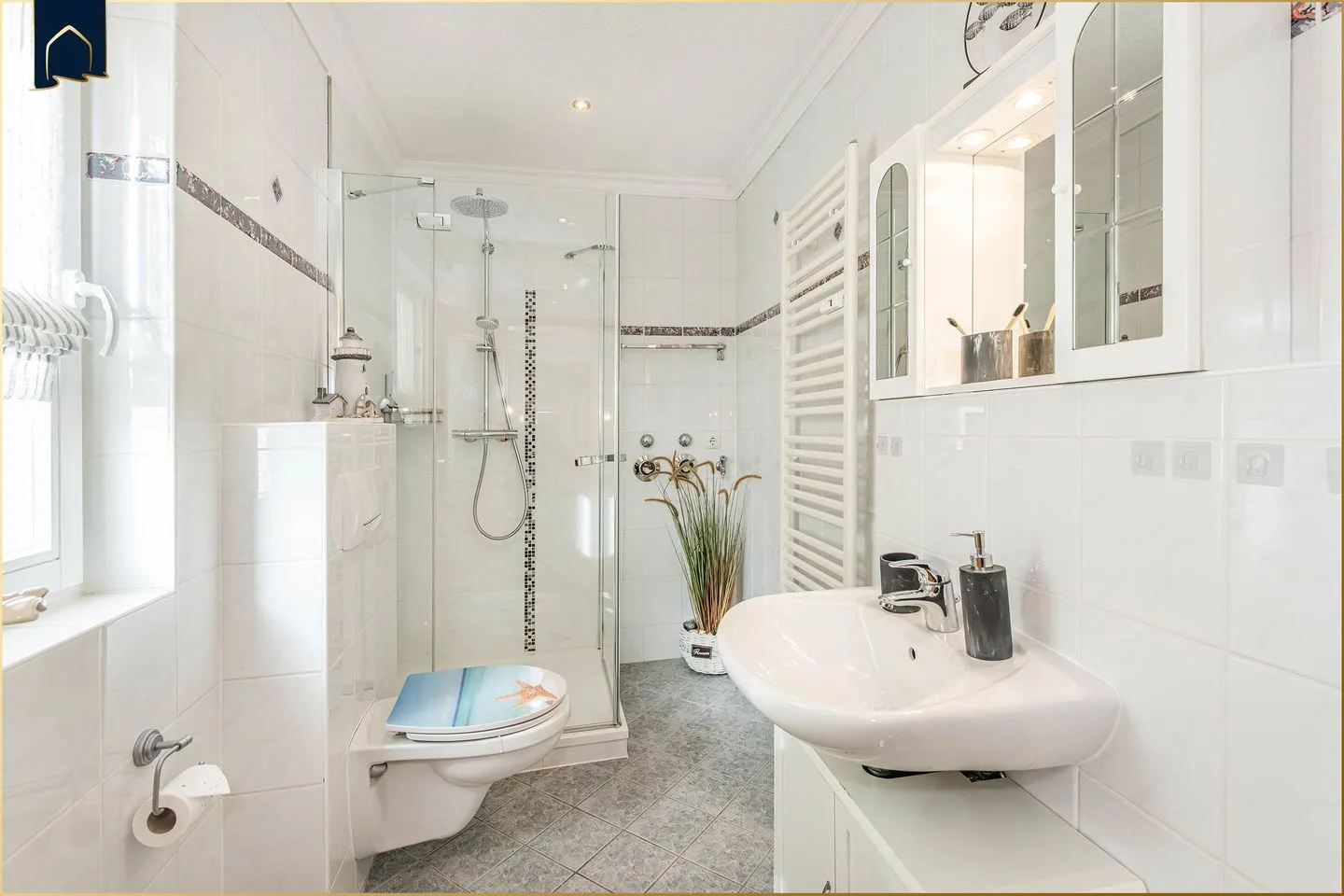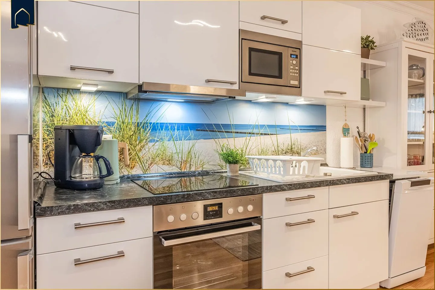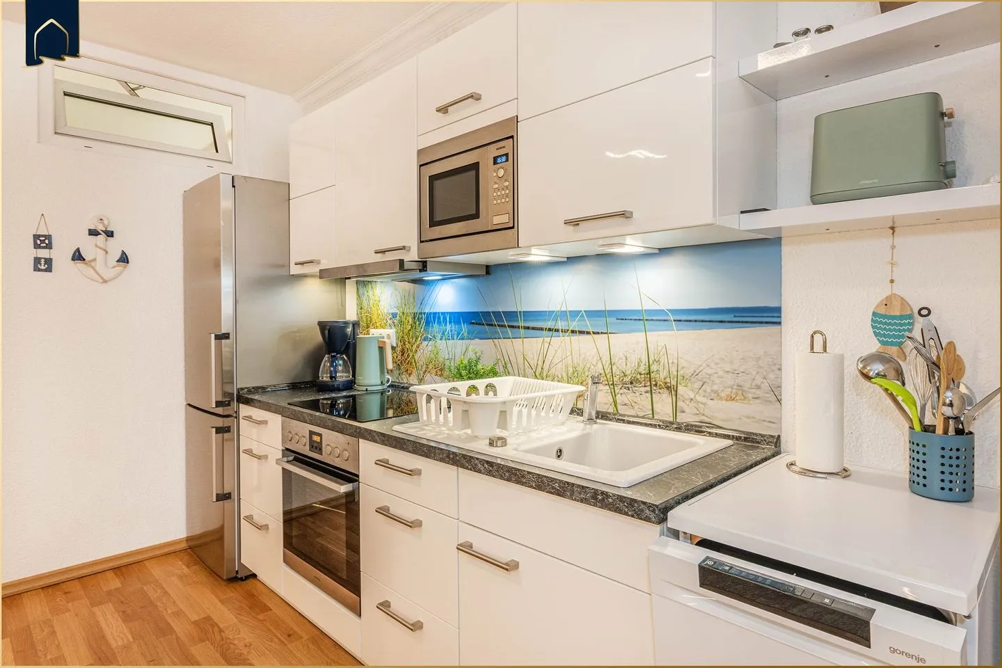 Die gut ausgestattete Küche verfügt über Herd, Backofen, Mikrowelle, Kühlschrank mit Gefrierfach, Kaffeemaschine, Toaster, Wasserkocher und Eierkocher – ideal für die Selbstversorgung im Urlaub. Zusätzlich stehen ein Badezimmer mit Dusche sowie ein separates Gäste-WC zur Verfügung. WLAN, Bücher und Spiele sorgen auch an ruhigeren Tagen für Unterhaltung. Fliegengitter, Sichtschutz an den Fenstern und viele praktische Details tragen zu einem angenehmen Aufenthalt bei. Ein privater Parkplatz direkt an der Unterkunft rundet das Angebot ab.