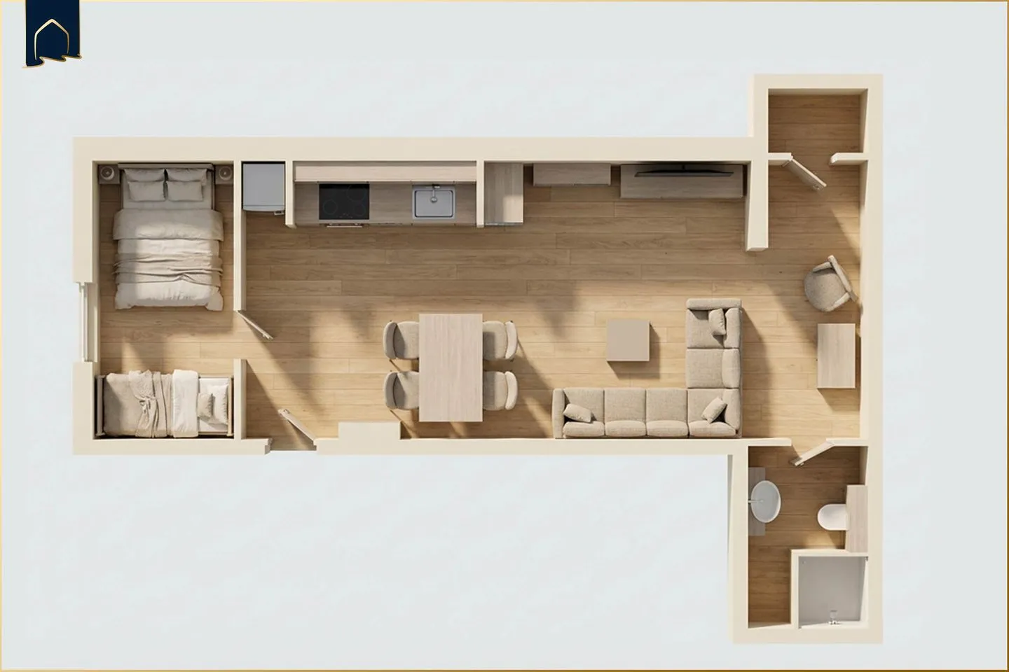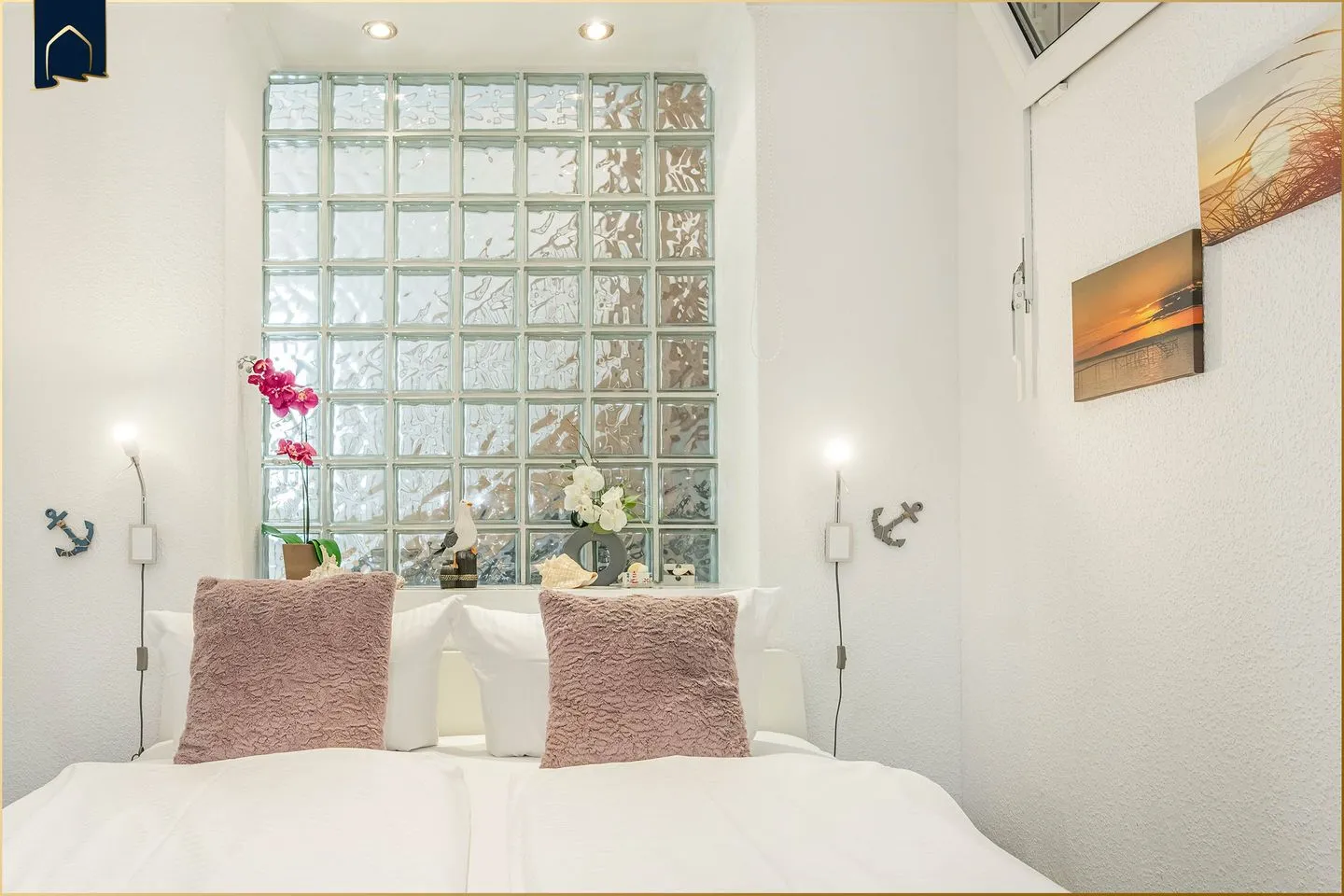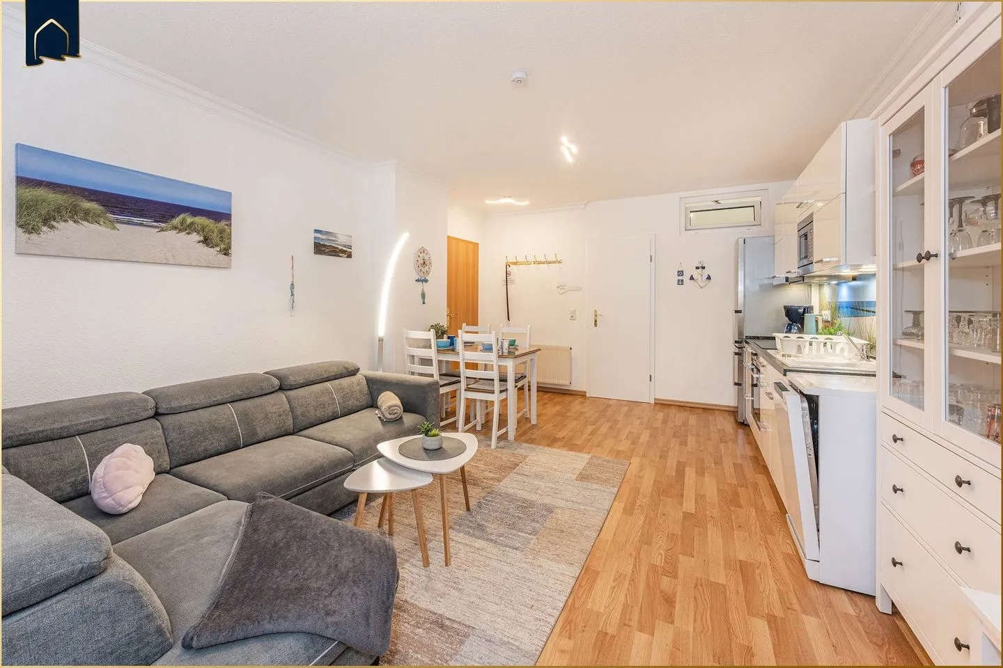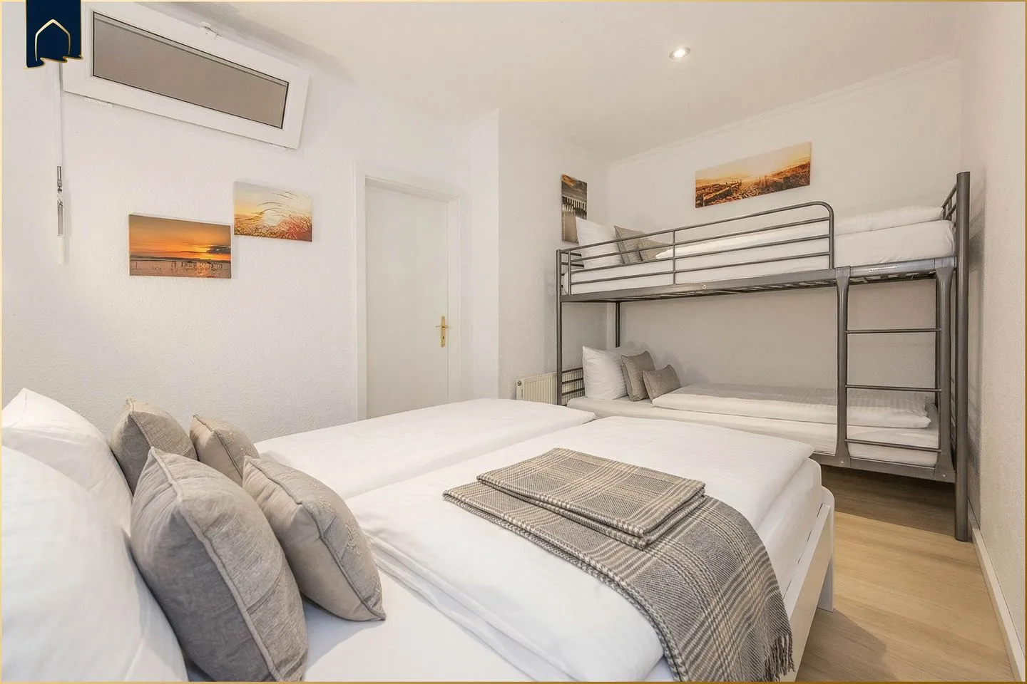 Mit einer Wohnfläche von rund 45 m² bietet die Ferienwohnung Platz für bis zu vier Personen. Das Schlafzimmer ist mit einem komfortablen Doppelbett sowie einem praktischen Etagenbett ausgestattet und eignet sich daher ideal für Familien mit Kindern. Der gemütliche Wohnbereich mit Sofa, Sessel und TV lädt zum Entspannen nach einem erlebnisreichen Urlaubstag ein. Ein separater Essbereich mit Esstisch bietet genügend Platz für gemeinsame Mahlzeiten oder gesellige Spieleabende.